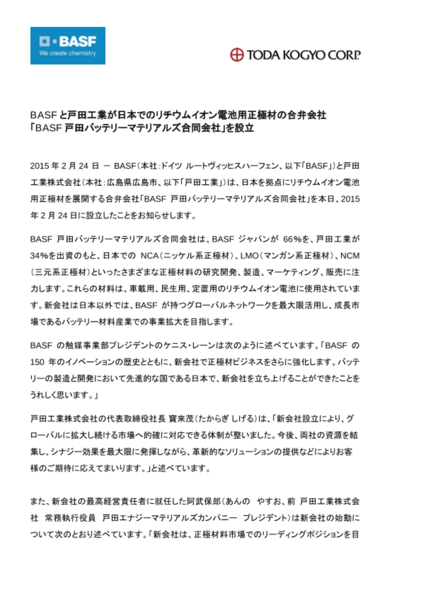 2015年2月24 日 - BASF(本社:ドイツ ルートヴィッヒスハーフェン、以下「BASF」)と戸田工業株式会社(本社:広島県広島市、以下「戸田工業」)は、日本を拠点にリチウムイオン電池用正極材を展開する合弁会社「BASF戸田バッテリーマテリアルズ合同会社」を本日、2015年2月24日に設立したことをお知らせします。