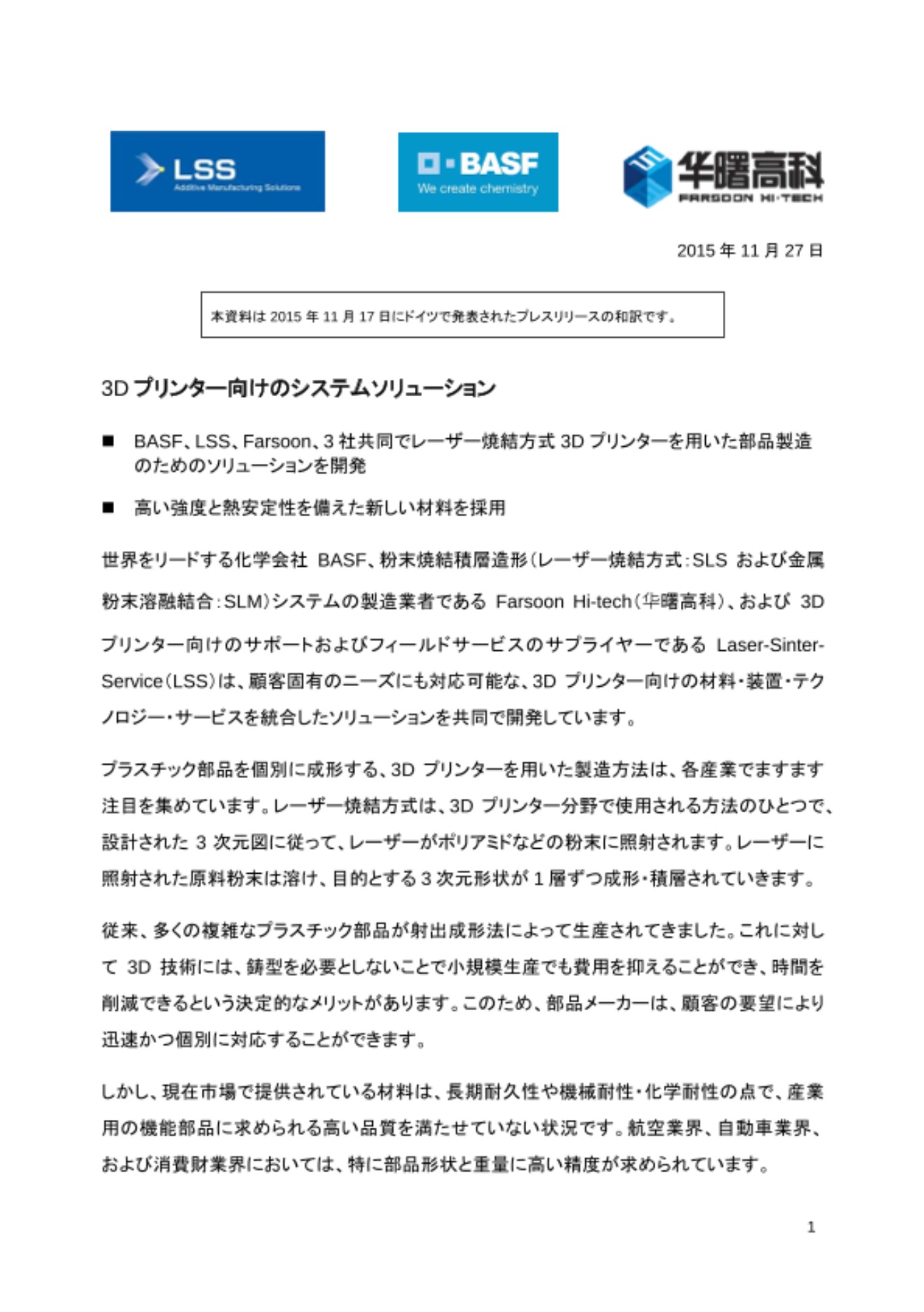 世界をリードする化学会社 BASF 、 粉末焼結積層造形 ( レーザー焼結方式: SLS および 金属粉末溶融結合: SLM )システムの製造業者である Farsoon Hi-tech ( 华 曙高科)、および 3D プリンター 向けのサポートおよびフィールドサービスのサプライヤ ー である Laser-Sinter-Service ( LSS )は、顧客固有のニーズに も対応 可能な 、 3D プリンター 向けの材料 ・装置・ テクノロジー ・ サービスを統合したソリューションを共同で開発 しています 。