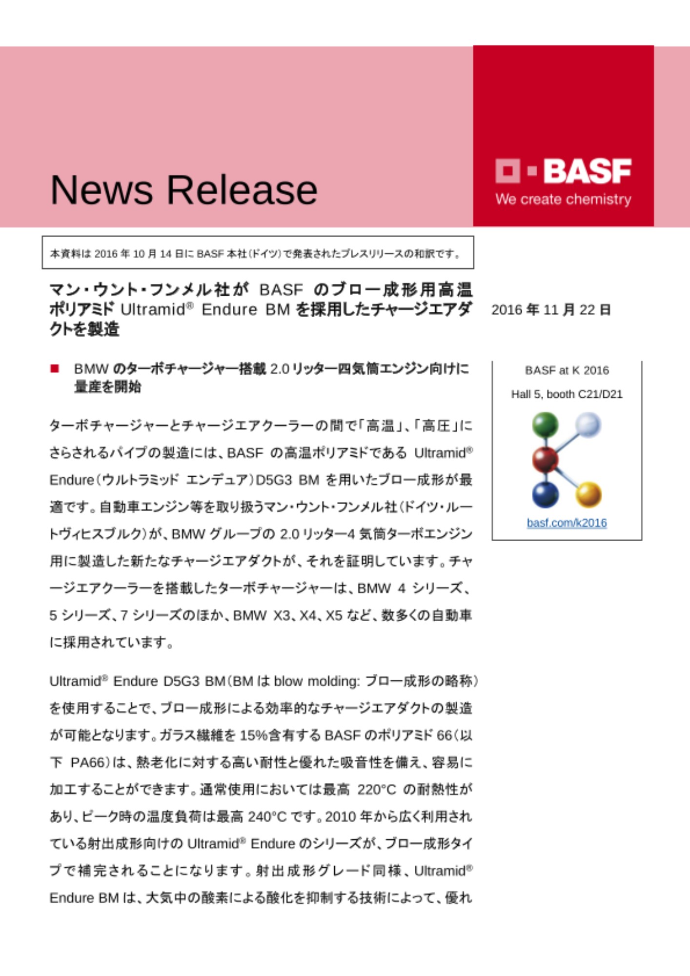 アイデアを理想的ソリューションに:BASFは、2016年10月19日~26日にドイツの デュッセルドルフで開催されたK fair(国際プラスチック・ゴム産業展)に出展しました。関連プレスリリース、画像、詳細情報は basf.com/k2016でご覧ください。