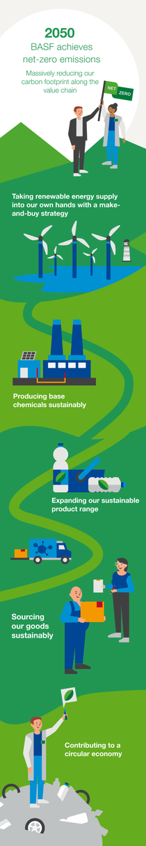 バリューチェーンに伴うサステナビリティに向けたBASFの取り組みについては、以下のイラスト画像をご覧ください。