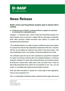 “The certification attests to our ability to produce certified low-carbon mass balance PU products that meet the high sustainability requirements of the ISCC+ standard. With this, we are helping our customers move ahead in their green journey,” said Andy Postlethwaite, Senior Vice President, Performance Materials Asia Pacific.