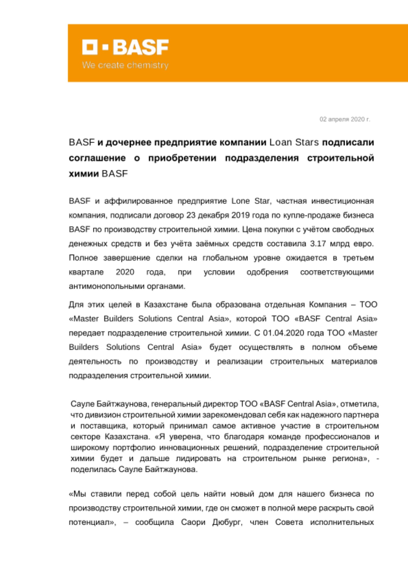 Для этих целей в Казахстане была образована отдельная Компания – ТОО «Master Builders Solutions Central Asia», которой ТОО «BASF Central Asia» передает подразделение строительной химии. С 01.04.2020 года ТОО «Master Builders Solutions Central Asia» будет осуществлять в полном объеме деятельность по производству и реализации строительных материалов подразделения строительной химии.