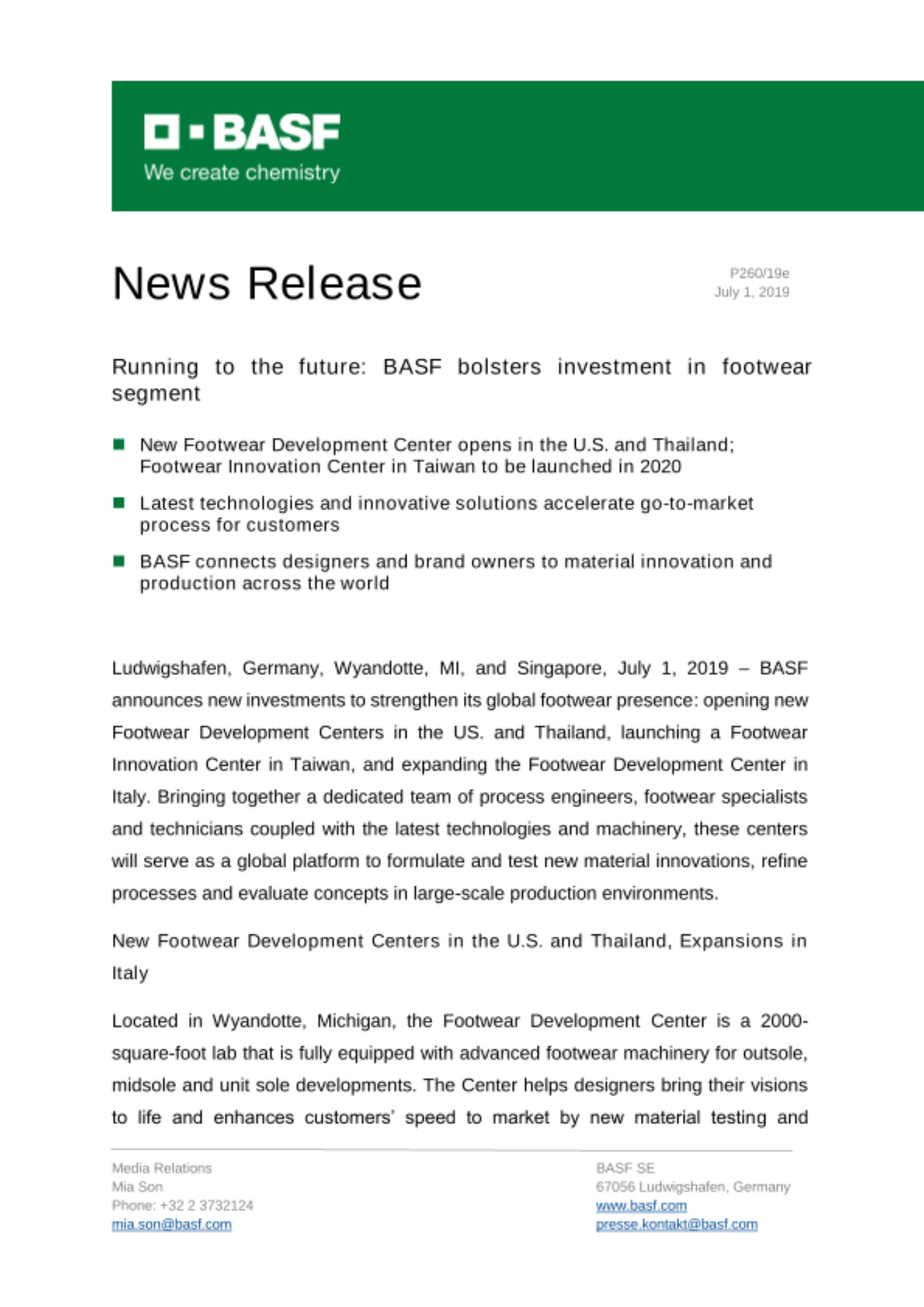 Ludwigshafen, Germany, Wyandotte, MI, and Singapore, July 1, 2019 – BASF announces new investments to strengthen its global footwear presence: opening new Footwear Development Centers in the US. and Thailand, launching a Footwear Innovation Center in Taiwan, and expanding the Footwear Development Center in Italy. Bringing together a dedicated team of process engineers, footwear specialists and technicians coupled with the latest technologies and machinery, these centers will serve as a global platform to formulate and test new material innovations, refine processes and evaluate concepts in large-scale production environments.