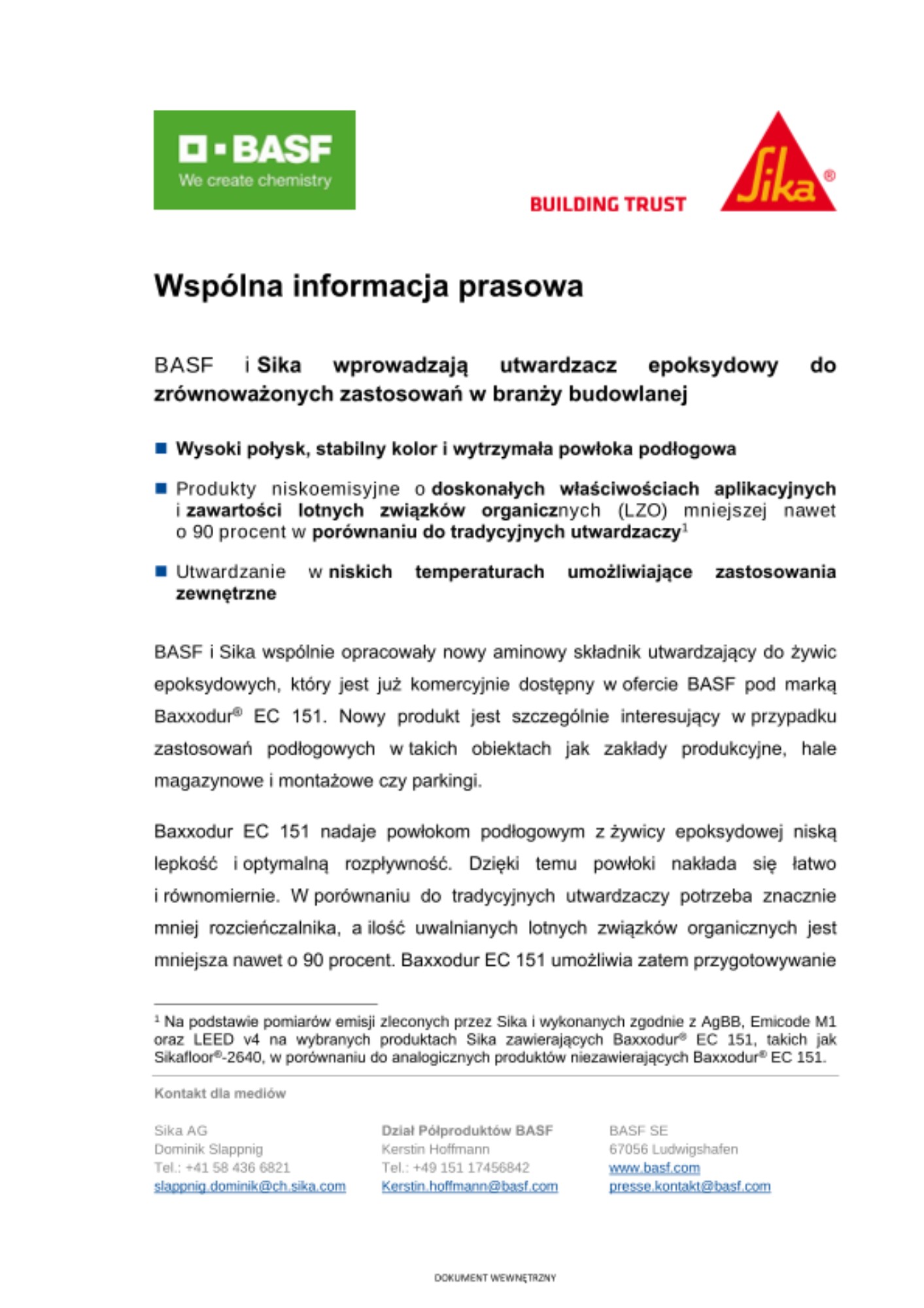 BASF i Sika wspólnie opracowały nowy aminowy składnik utwardzający do żywic epoksydowych, który jest już komercyjnie dostępny w ofercie BASF pod marką Baxxodur® EC 151. Nowy produkt jest szczególnie interesujący w przypadku zastosowań podłogowych w takich obiektach jak zakłady produkcyjne, hale magazynowe i montażowe czy parkingi.