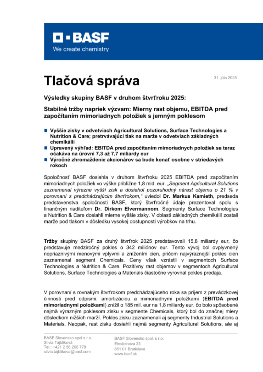 Spoločnosť BASF dosiahla v druhom štvrťroku 2025 EBITDA pred započítaním mimoriadnych položiek vo výške približne 1,8 mld. eur. „Segment Agricultural Solutions zaznamenal výrazne vyšší zisk a dosiahol pozoruhodný nárast objemu o 21 % v porovnaní s predchádzajúcim štvrťrokom,“ uviedol Dr. Markus Kamieth, predseda predstavenstva spoločnosti BASF, ktorý štvrťročné údaje prezentoval spolu s finančným riaditeľom Dr. Dirkom Elvermannom. Segmenty Surface Technologies a Nutrition & Care dosiahli mierne vyššie zisky. V oblasti základných chemikálií zostali marže pod tlakom v dôsledku vysokej dostupnosti výrobkov na trhu.