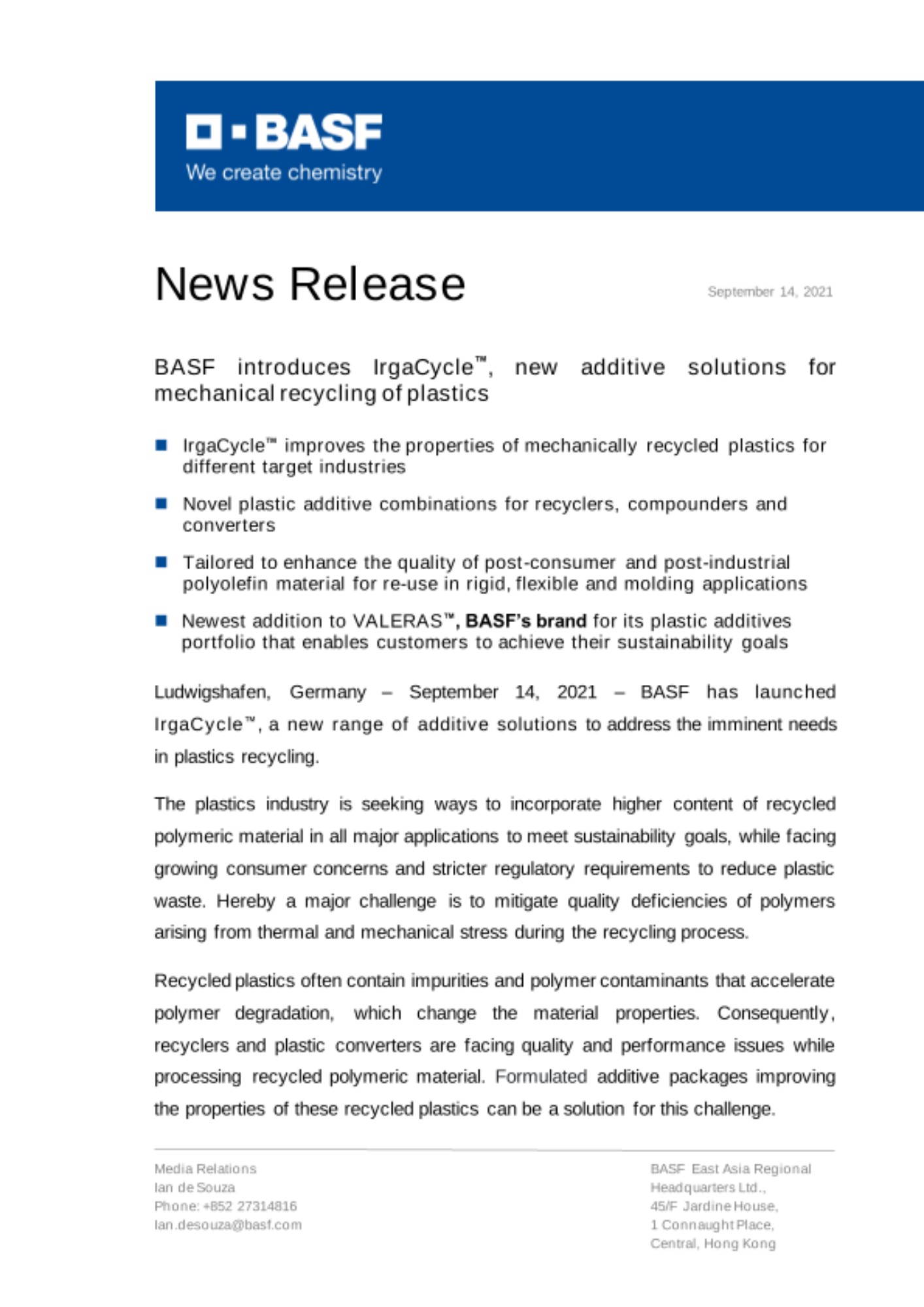 Ludwigshafen, Germany – September 14, 2021 – BASF has launched IrgaCycle™, a new range of additive solutions to address the imminent needs in plastics recycling.