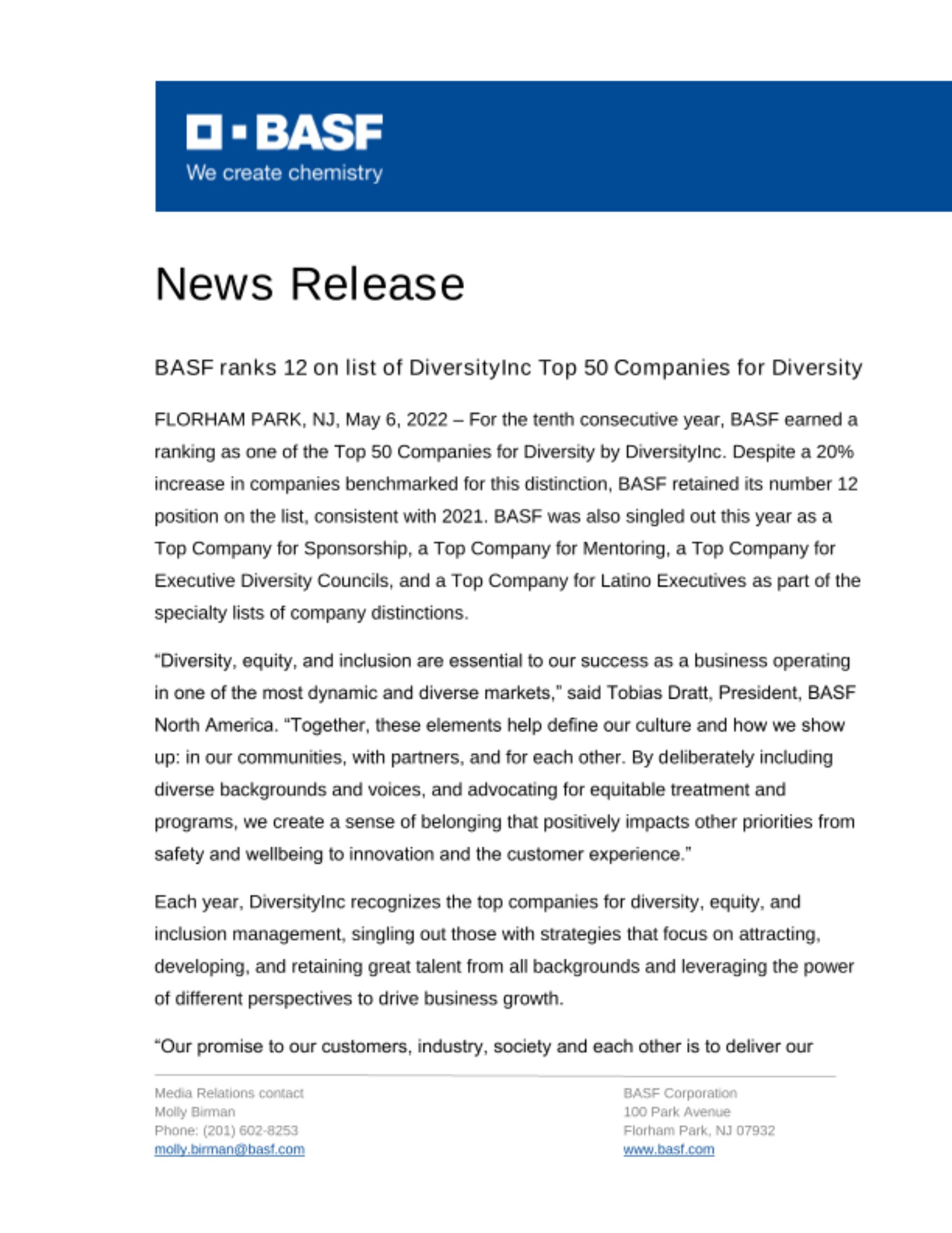 FLORHAM PARK, NJ, May 6, 2022 – For the tenth consecutive year, BASF earned a ranking as one of the Top 50 Companies for Diversity by DiversityInc. Despite a 20% increase in companies benchmarked for this distinction, BASF retained its number 12 position on the list, consistent with 2021. BASF was also singled out this year as a Top Company for Sponsorship, a Top Company for Mentoring, a Top Company for Executive Diversity Councils, and a Top Company for Latino Executives as part of the specialty lists of company distinctions.