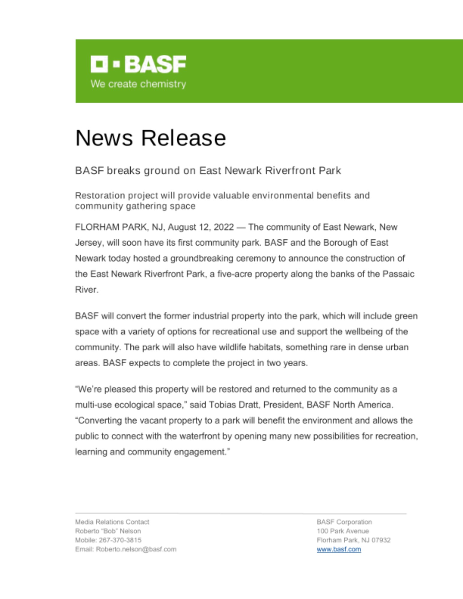 FLORHAM PARK, NJ, August 12, 2022 — The community of East Newark, New Jersey, will soon have its first community park. BASF and the Borough of East Newark today hosted a groundbreaking ceremony to announce the construction of the East Newark Riverfront Park, a five-acre property along the banks of the Passaic River.
