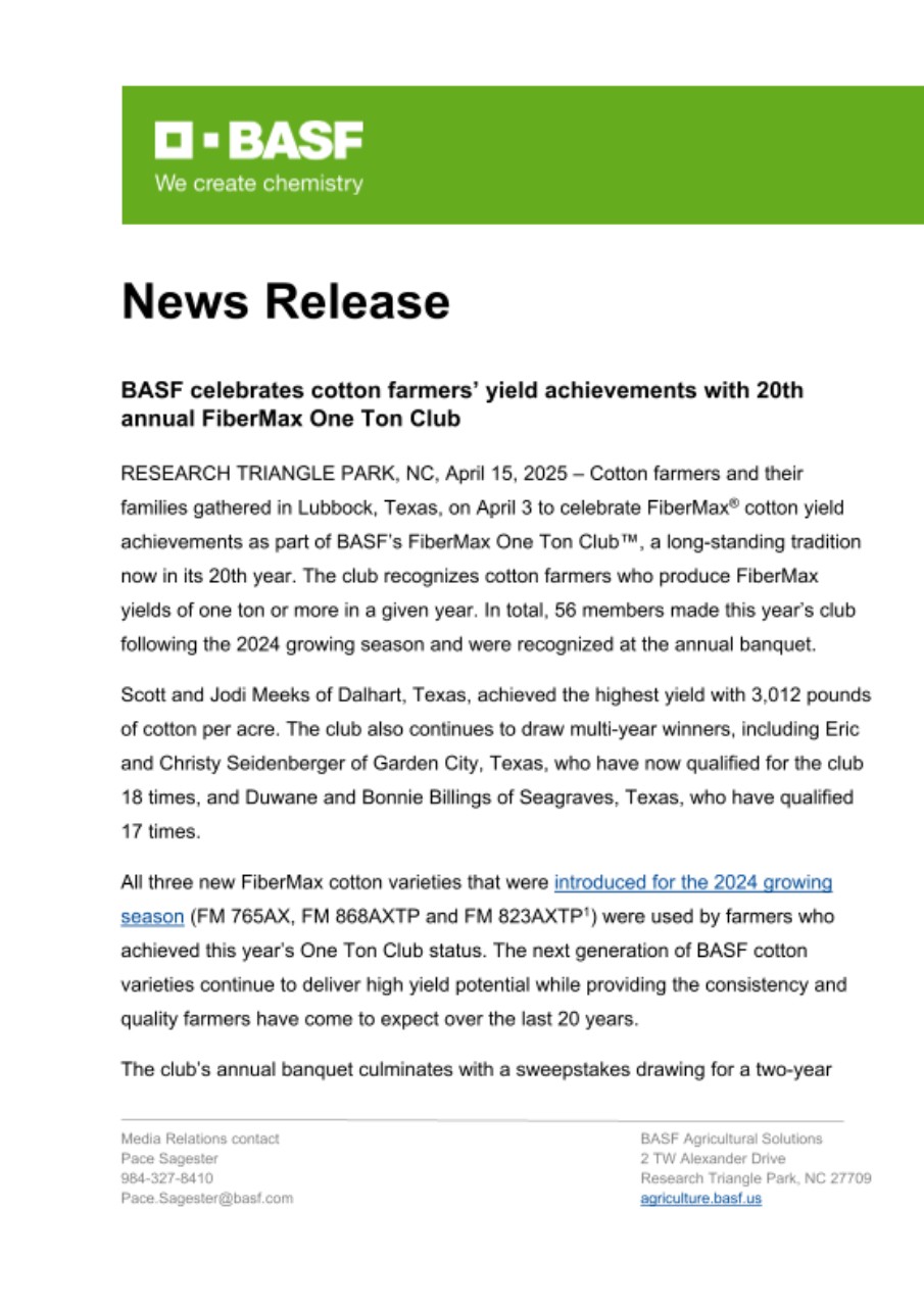 “The FiberMax One Ton Club is an important and meaningful tradition at BASF and we are proud to have honored cotton farmers’ achievements now for 20 years,” said Mark Kelling, Area Manager at BASF Agricultural Solutions. “BASF is committed to helping cotton farmers doing the Biggest Job on Earth and we are always excited to recognize farmers who have trusted FiberMax cotton to answer the call to this unique challenge.”