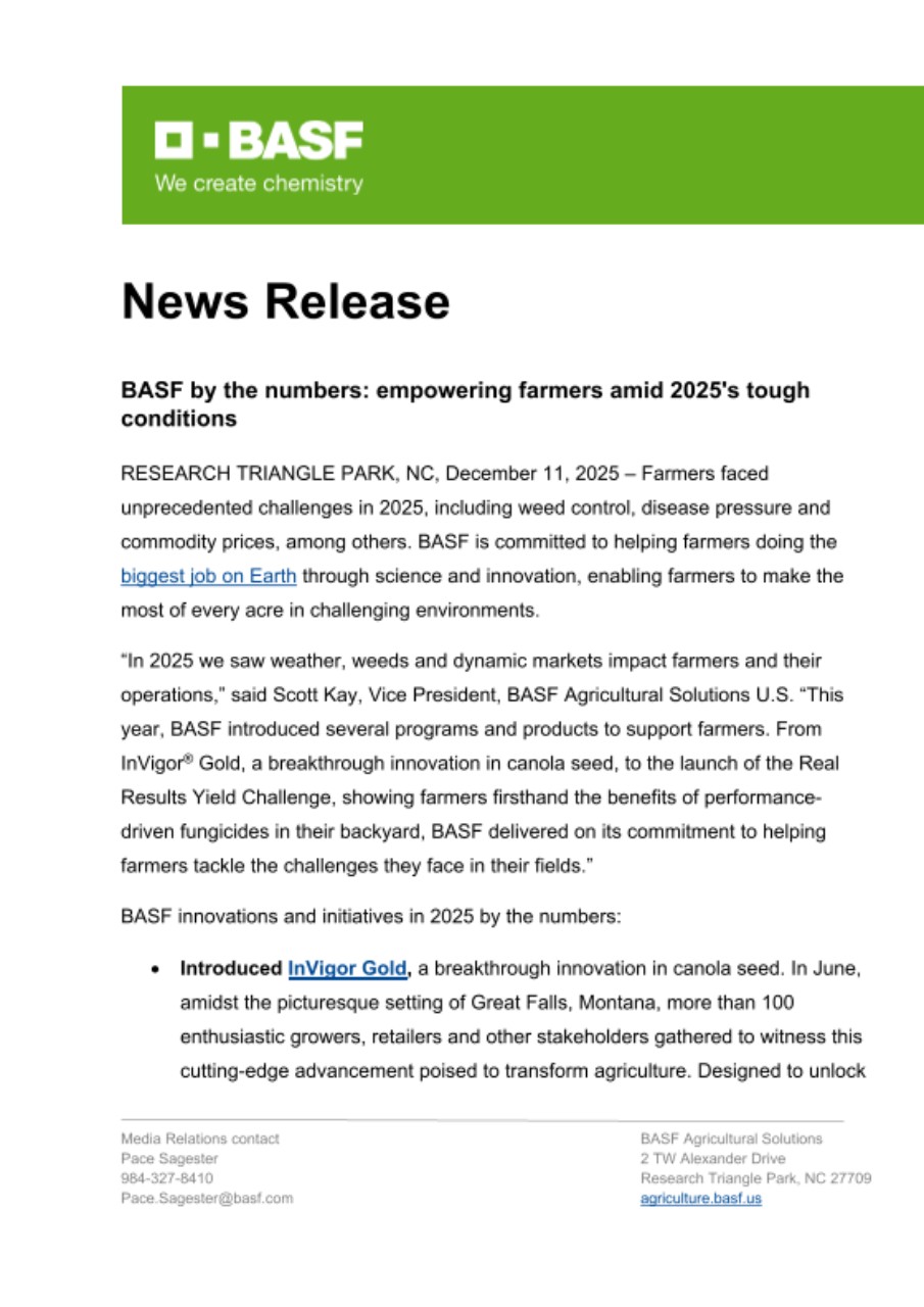 “In 2025 we saw weather, weeds and dynamic markets impact farmers and their operations,” said Scott Kay, Vice President, BASF Agricultural Solutions U.S. “This year, BASF introduced several programs and products to support farmers. From InVigor® Gold, a breakthrough innovation in canola seed, to the launch of the Real Results Yield Challenge, showing farmers firsthand the benefits of performance-driven fungicides in their backyard, BASF delivered on its commitment to helping farmers tackle the challenges they face in their fields.”