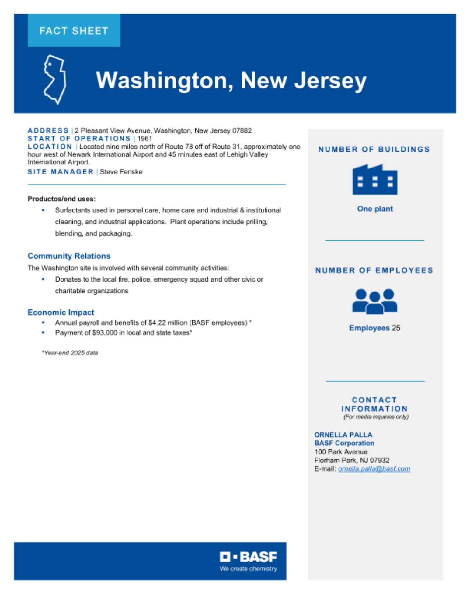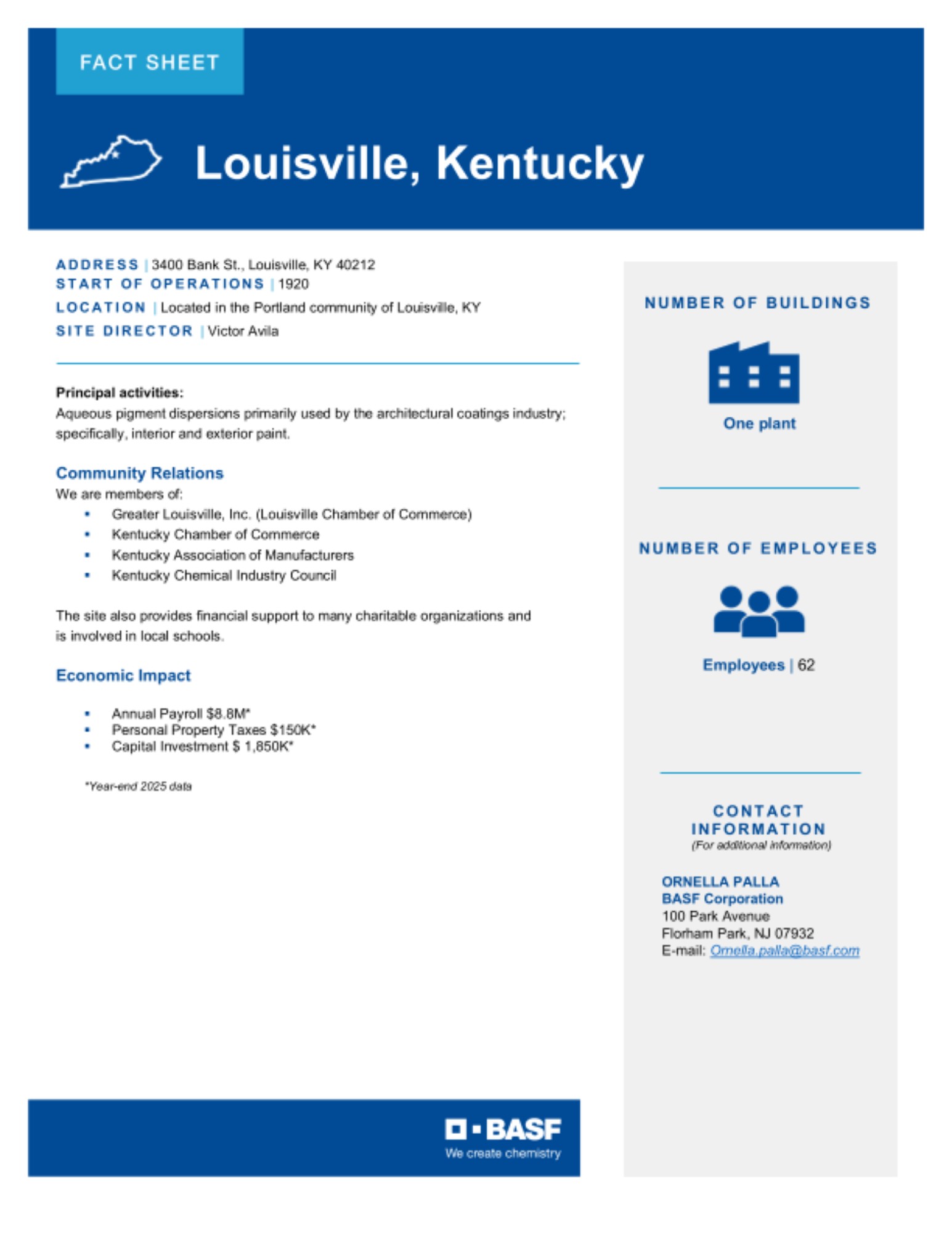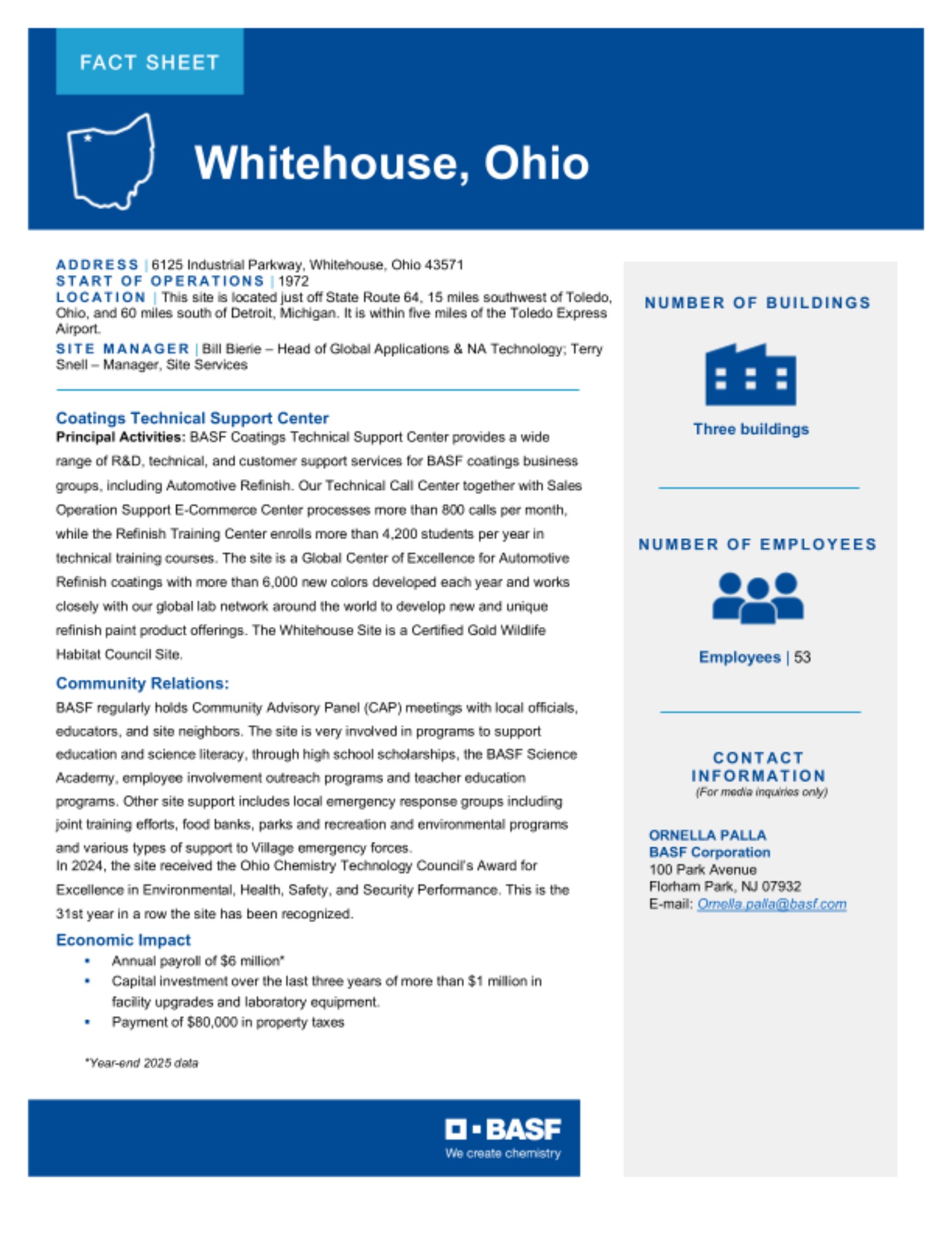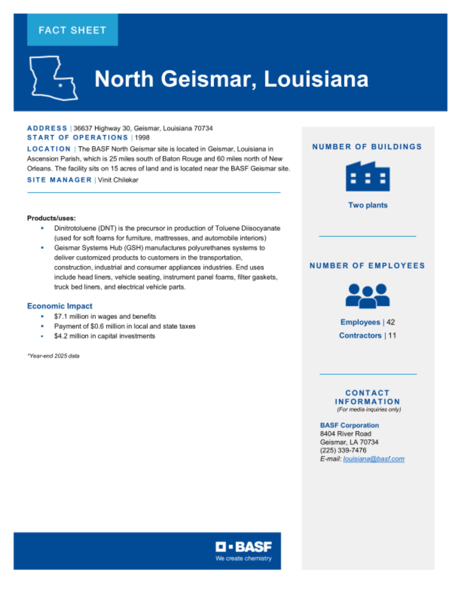 The Site Fact Sheets below provide overviews of BASF's key manufacturing sites in the U.S., including what is manufactured at each site and the site's local economic impact.