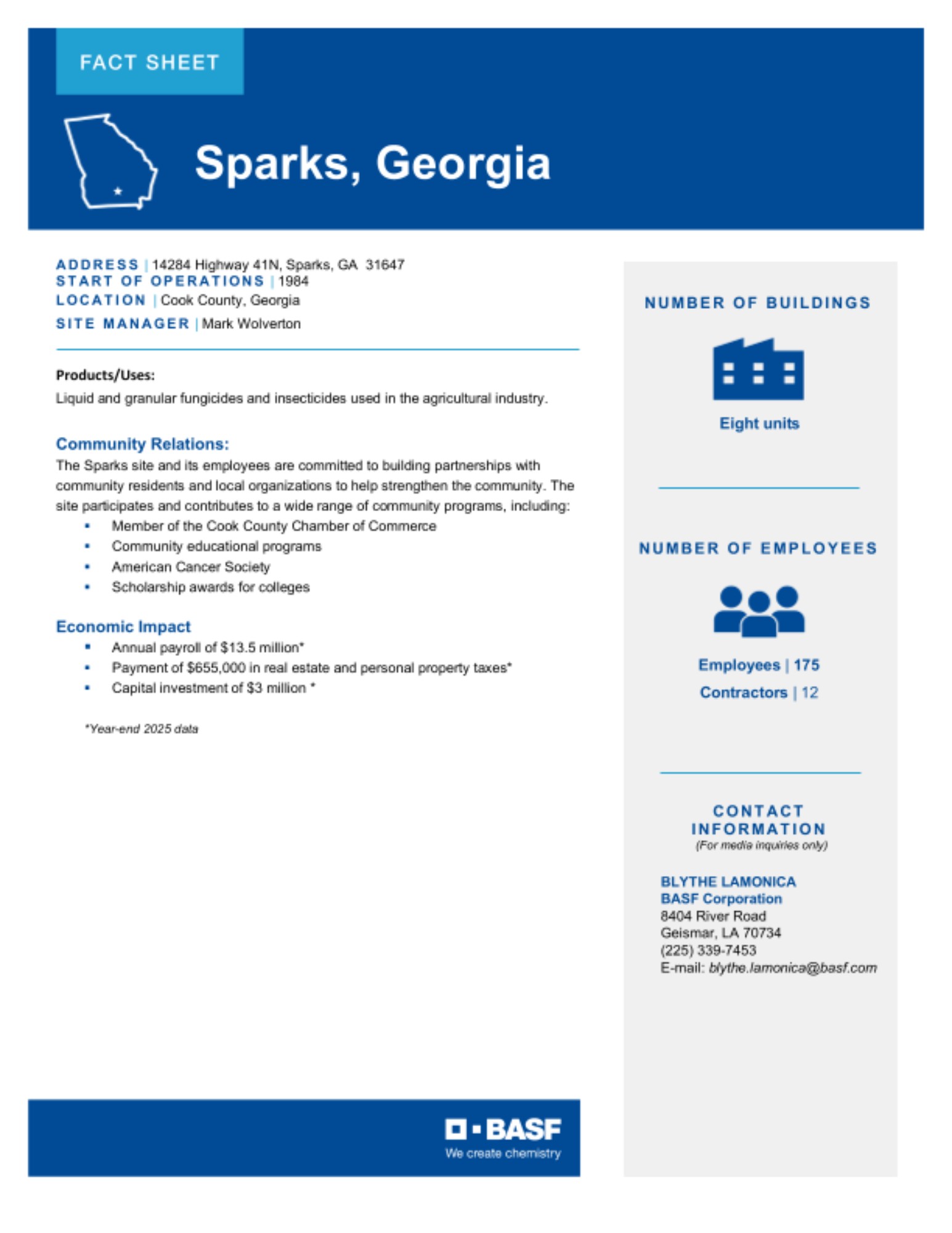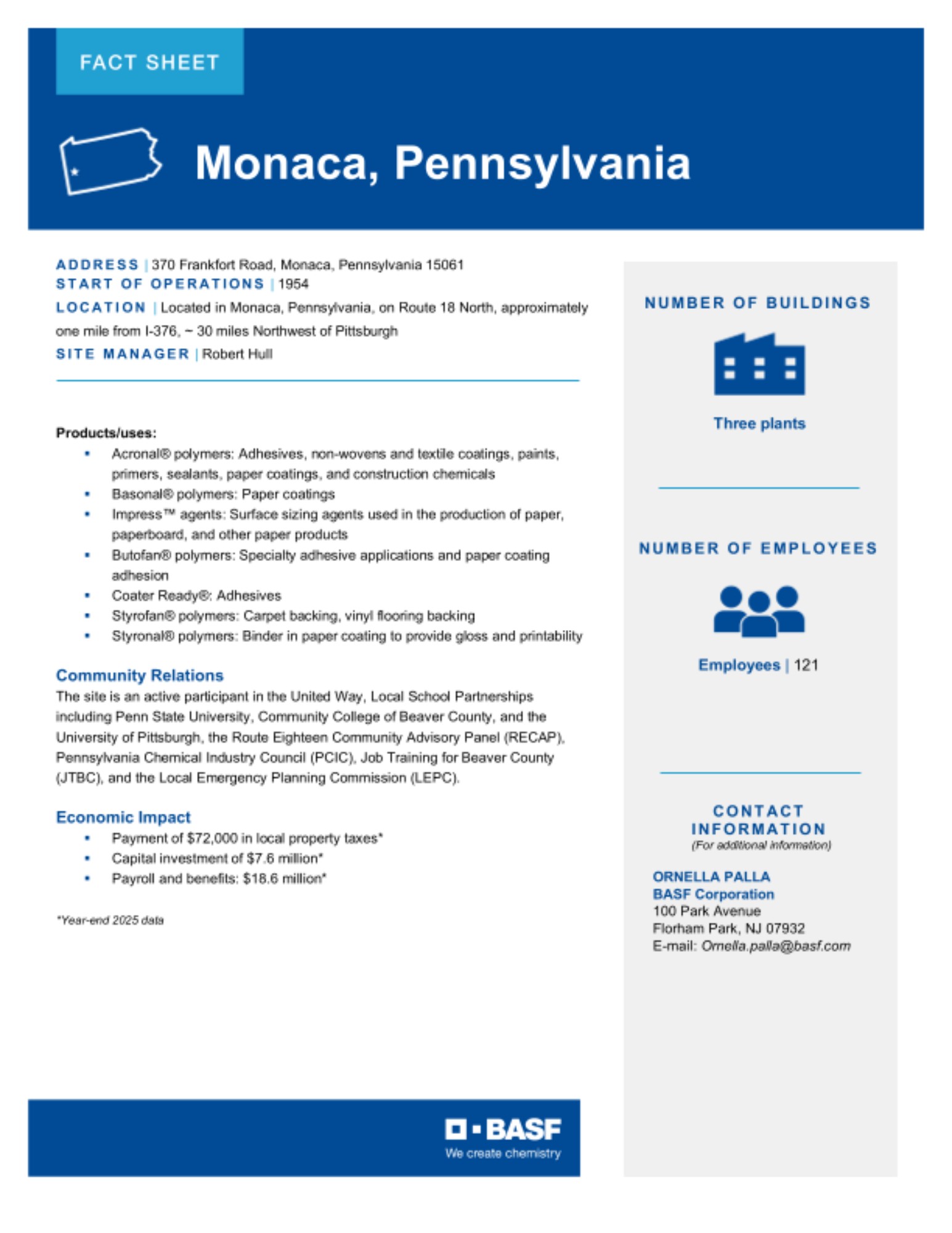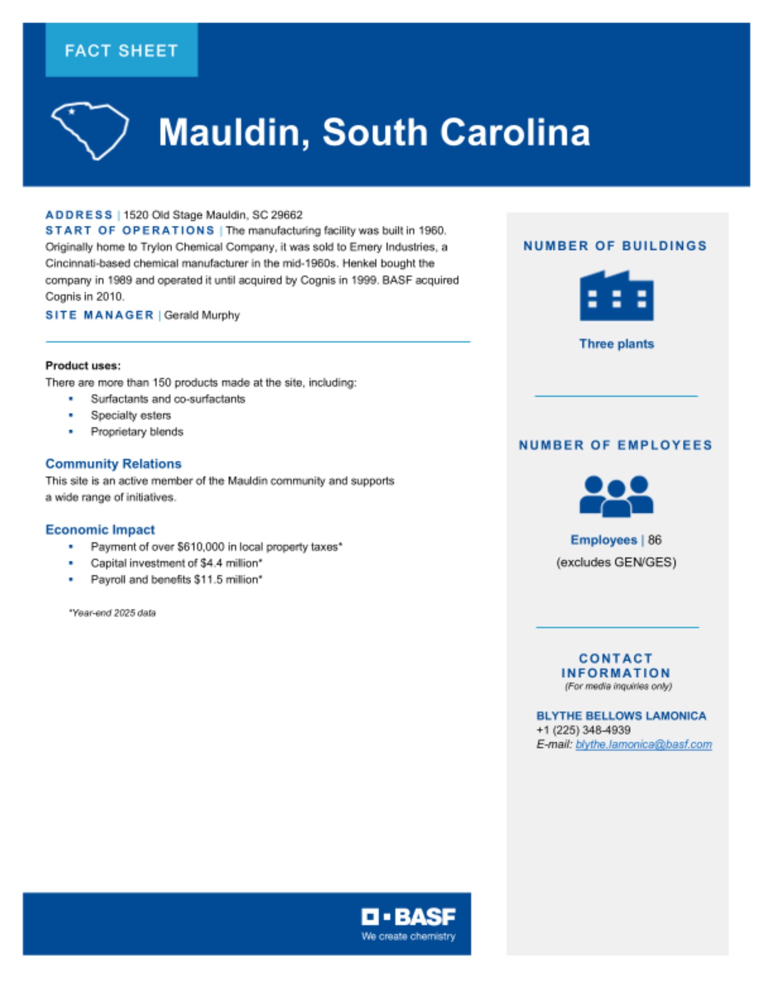 The Site Fact Sheets below provide overviews of BASF's key manufacturing sites in the U.S., including what is manufactured at each site and the site's local economic impact.