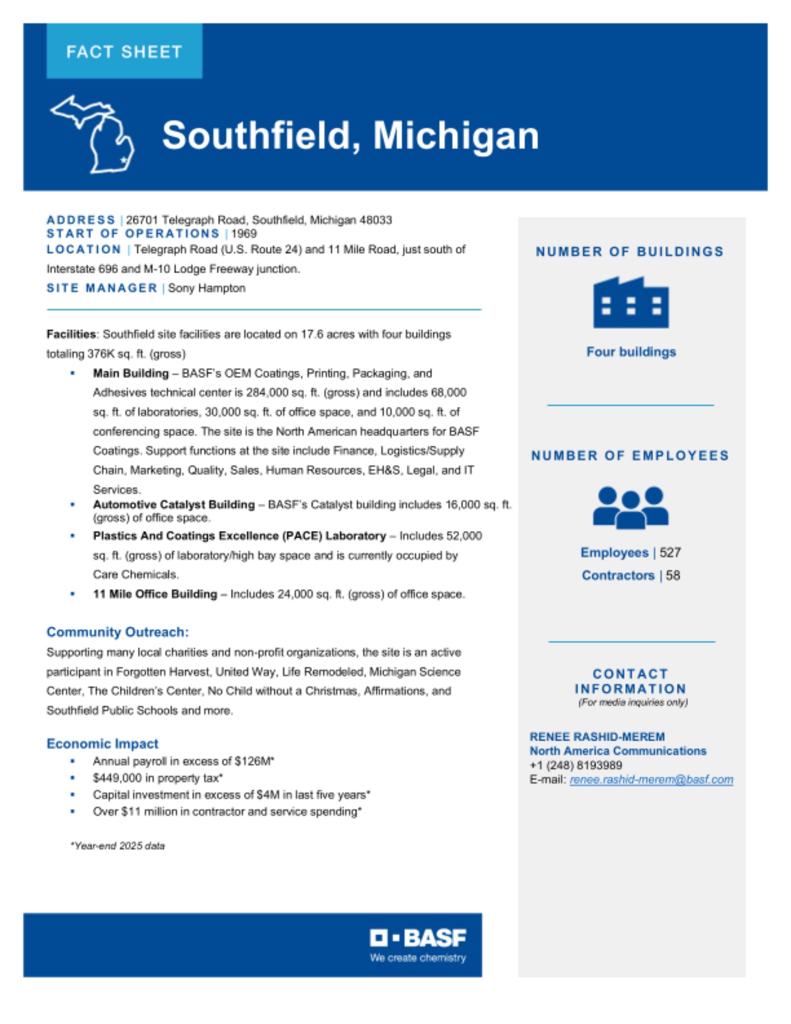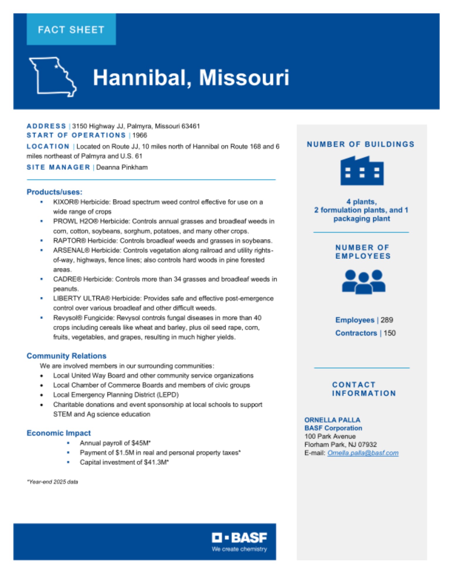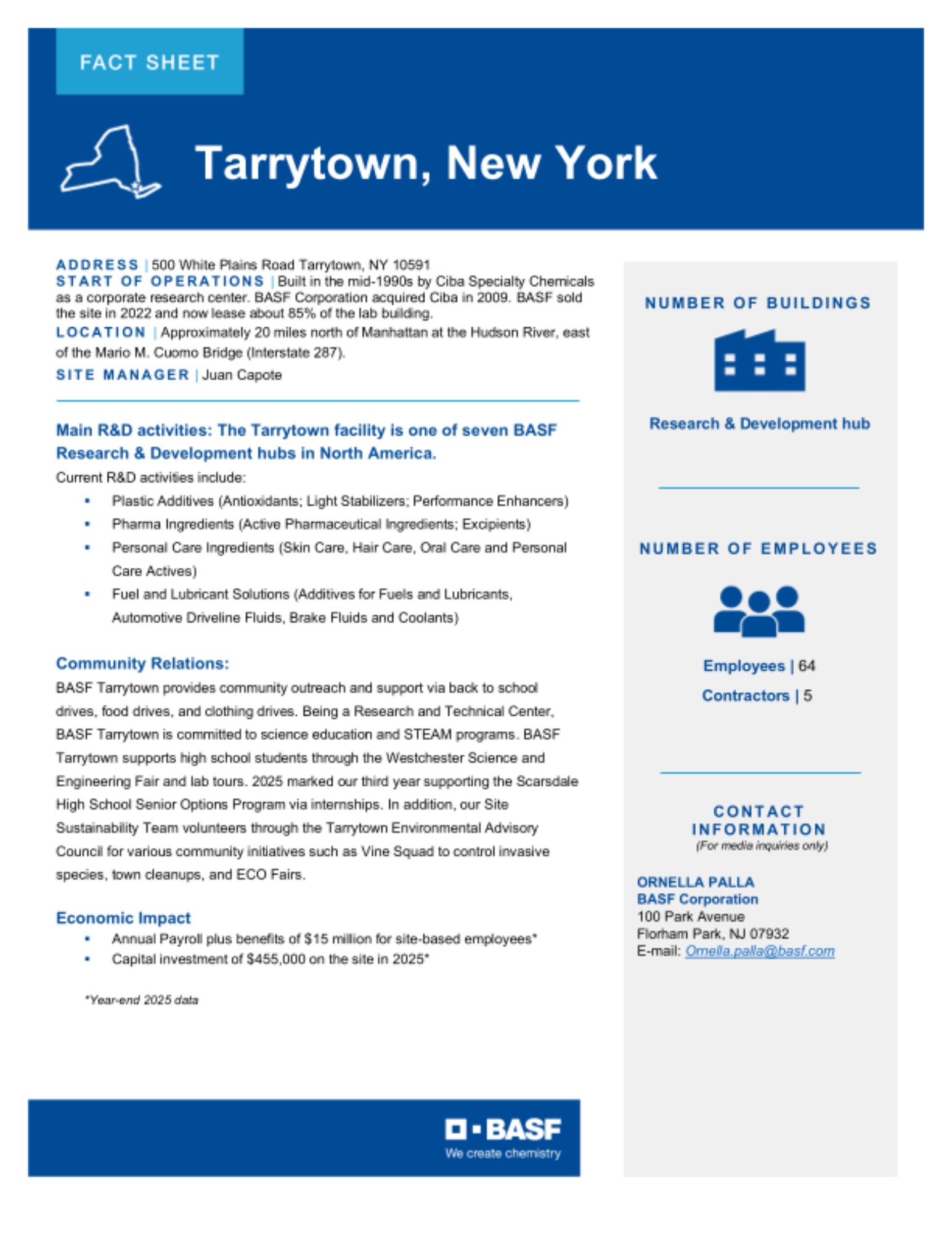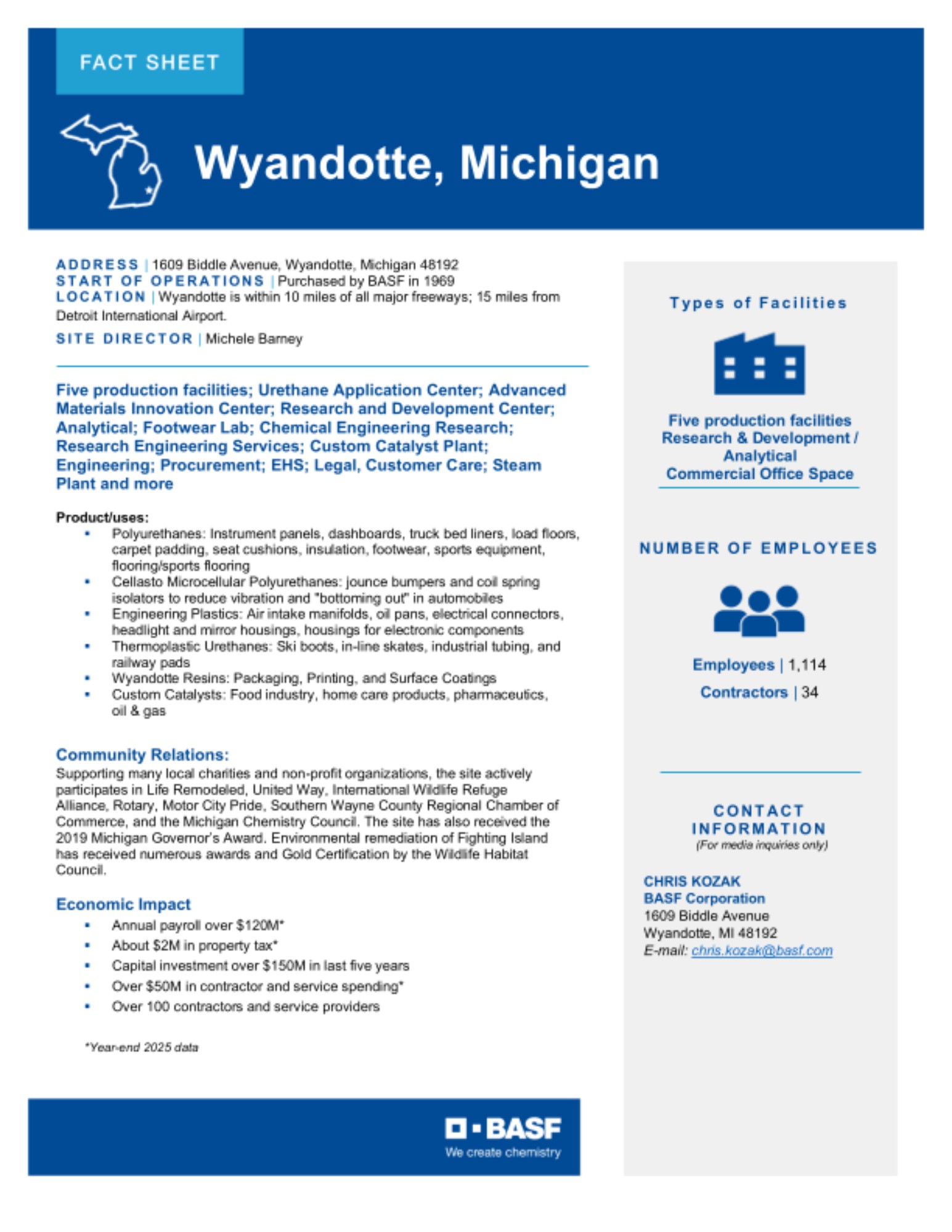 The Site Fact Sheets below provide overviews of BASF's key manufacturing sites in the U.S., including what is manufactured at each site and the site's local economic impact.