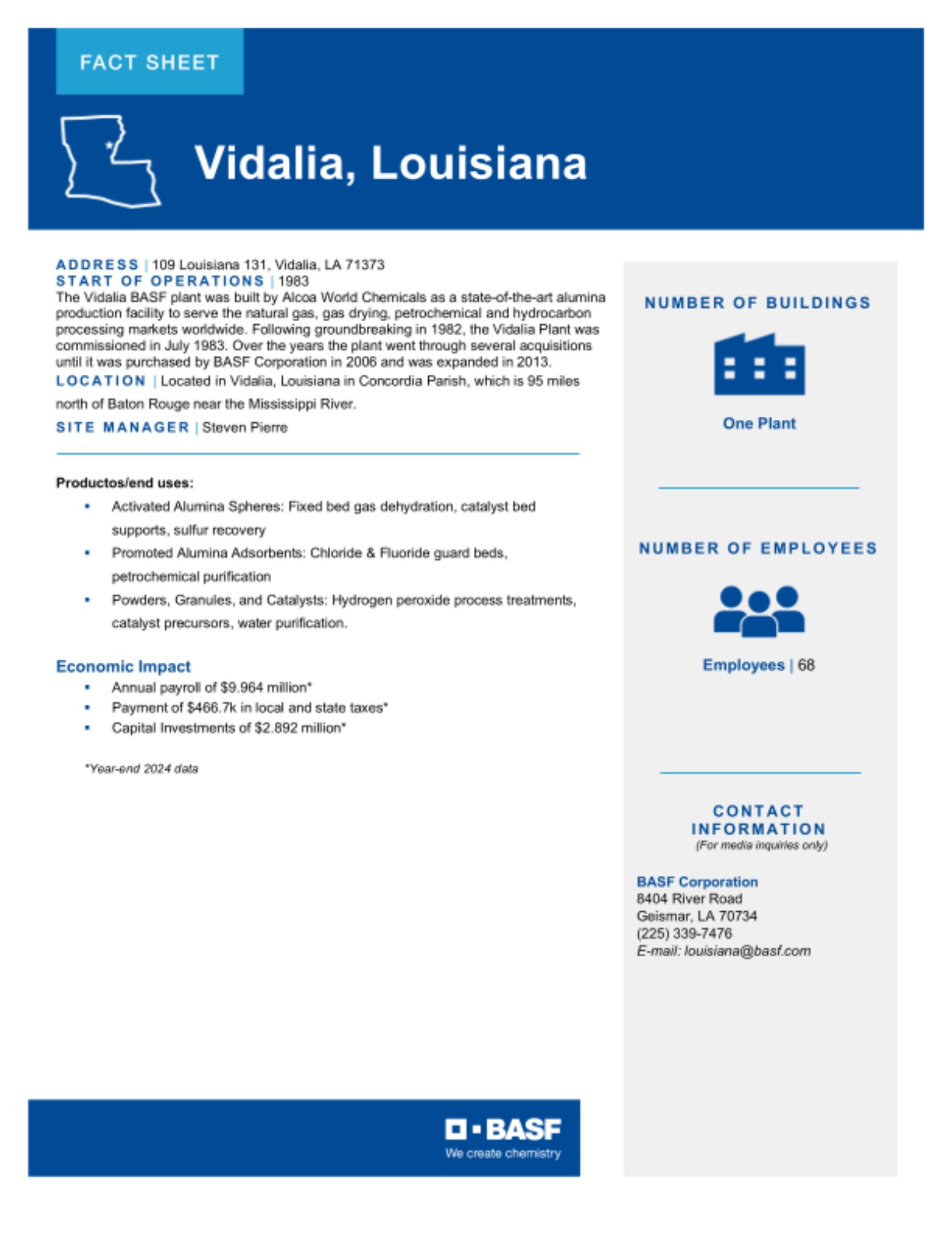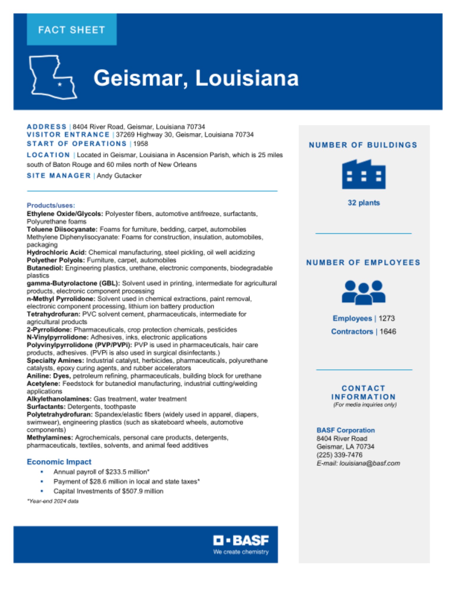 BASF’s manufacturing presence in Louisiana includes operations in Geismar, North Geismar, and Vidalia.