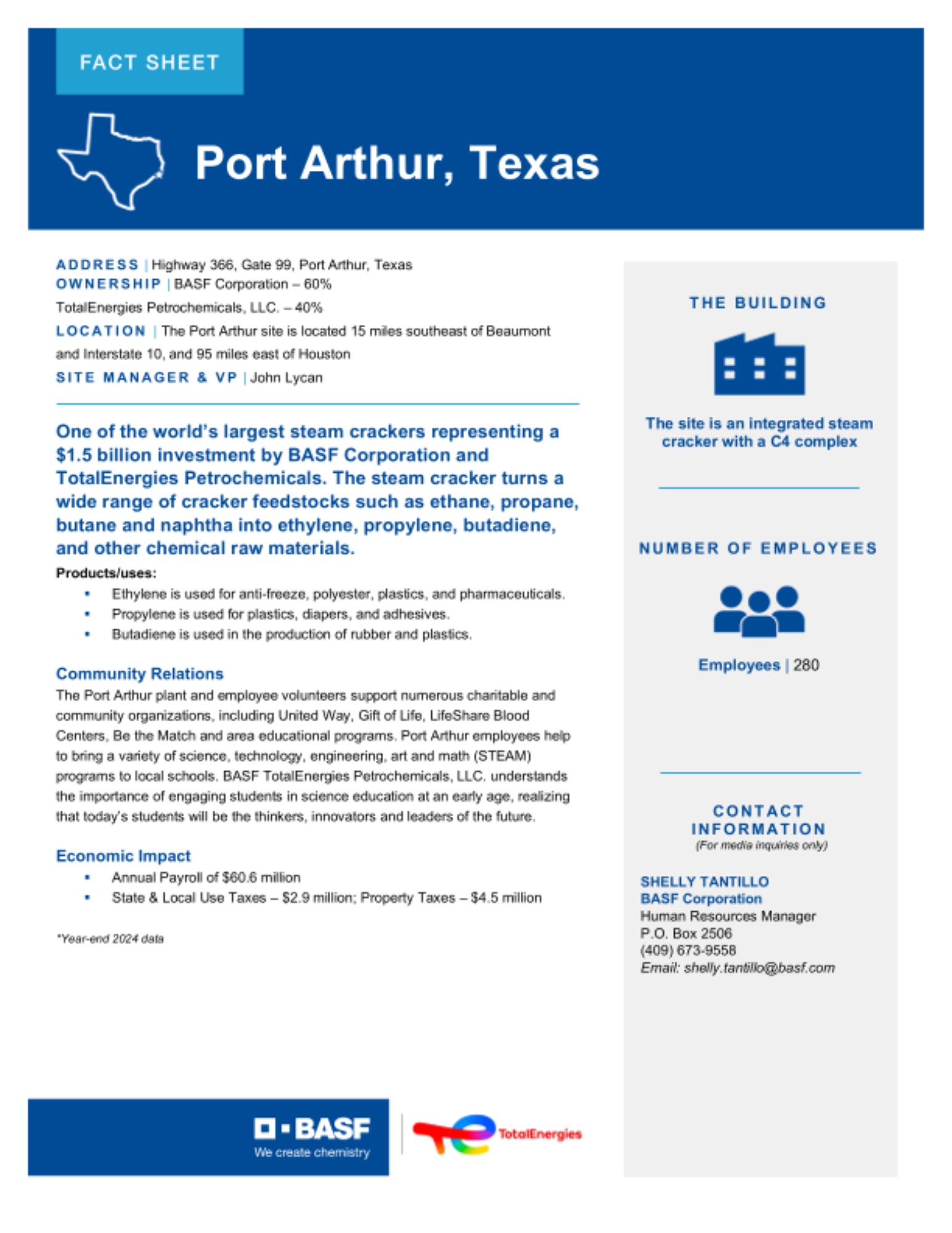 BASF’s presence in Texas includes manufacturing operations and business headquarters across multiple sites around the state. We employ over 3,200 people in all areas of our business throughout the sites. We live in the communities where we work, so we invest in those same communities through jobs, purchasing, taxes and charitable contributions.