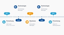 Ich habe in Frankreich promoviert, in England meinen Postdoc absolviert und startete bei BASF in der Aminsynthese und durfte direkt eine Miniplant mitbetreuen. Das war ein Sprung ins kalte Wasser, denn ich kam aus der Ecke der Naturstoffchemie. Nach fünf Jahren Forschung wechselte ich zu Intermediates, erst als Technologiemanagerin, dann ins Innovationsmanagement und war am Ende zuständig für das Asset Target Picture. Ich saß zu Beginn im Großraumbüro und das war großartig, da ich von meinen Kolleg:innen super viel mitbekommen und gelernt habe. Meinen Bezug zu Aminen verlor ich auch bei Intermediates nie, sondern änderte nur die Perspektive. Als ich 2021 zurück in die Forschung wechselte, übernahm ich die Leitung des Teams, bei dem ich 10 Jahre zuvor angefangen hatte und der fachliche Kreis schloss sich stimmig für mich. Das Besondere an meiner Position ist, dass ich mir die Stelle mit einer Kollegin im Rahmen von Job-Sharing teile, und das funktioniert für alle Beteiligten. Es ist für mich immer wichtig gewesen, auch für meine Familie da sein zu können und sie war immer Teil meiner Entscheidungen, ob ich eine Stelle antrete oder nicht. Mit der Job-Sharing Stelle kann ich meiner Familie und gleichzeitig der Firma auf beste Weise gerecht werden.