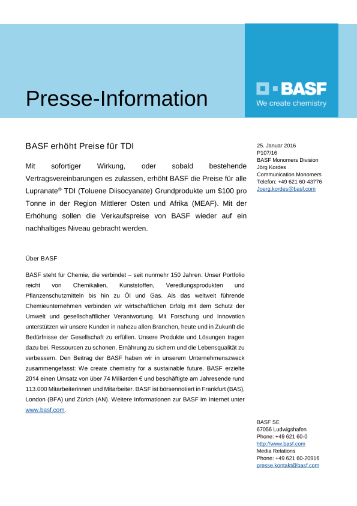 Mit sofortiger Wirkung, oder sobald bestehende Vertragsvereinbarungen es zulassen, erhöht BASF die Preise für alle Lupranate® TDI (Toluene Diisocyanate) Grundprodukte um $100 pro Tonne in der Region Mittlerer Osten und Afrika (MEAF). Mit der Erhöhung sollen die Verkaufspreise von BASF wieder auf ein nachhaltiges Niveau gebracht werden.