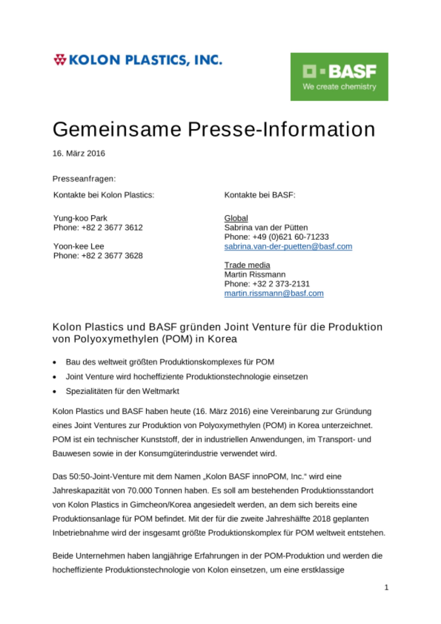 Kolon Plastics und BASF haben heute (16. März 2016) eine Vereinbarung zur Gründung eines Joint Ventures zur Produktion von Polyoxymethylen (POM) in Korea unterzeichnet. POM ist ein technischer Kunststoff, der in industriellen Anwendungen, im Transport- und Bauwesen sowie in der Konsumgüterindustrie verwendet wird.