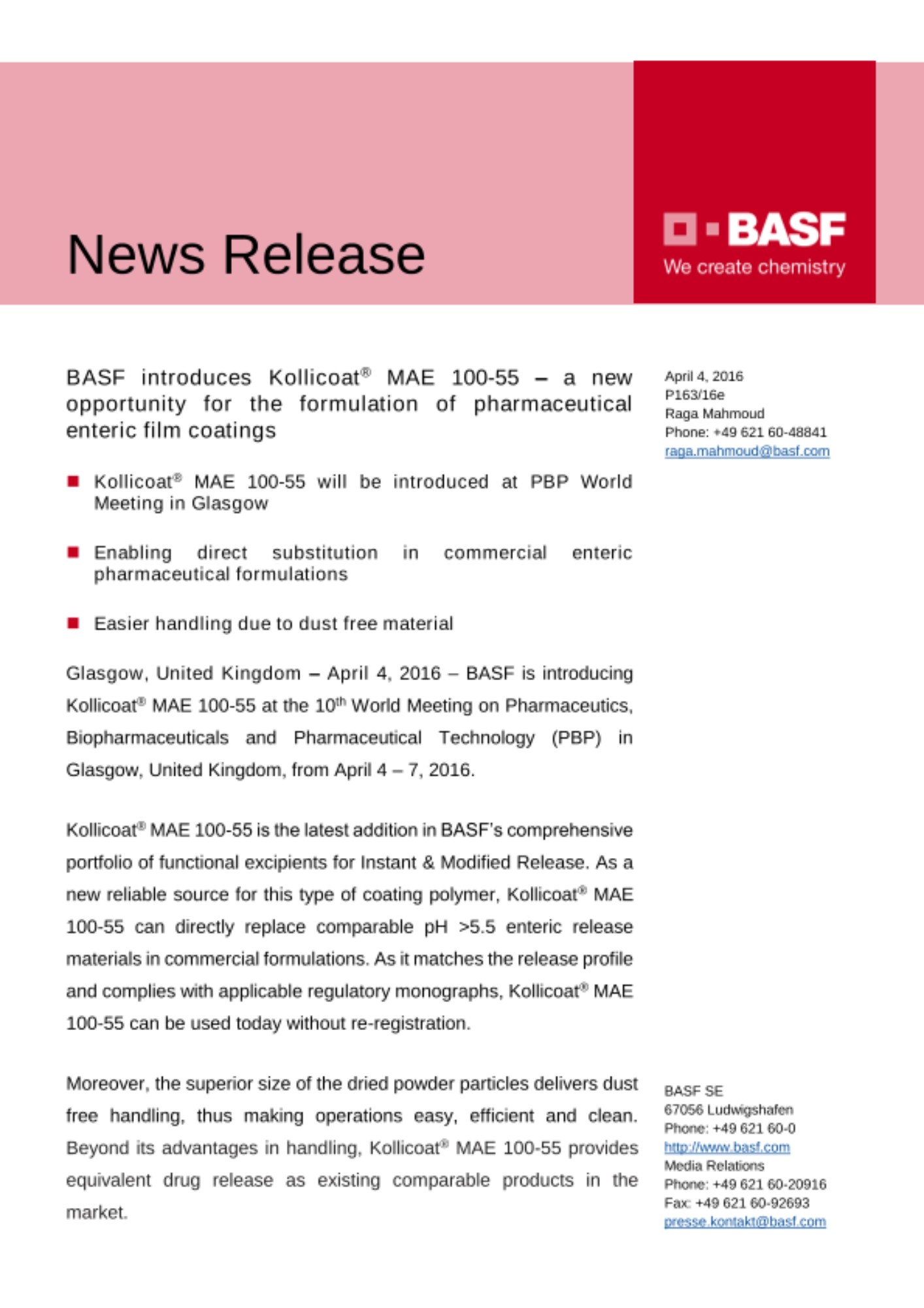 Glasgow, United Kingdom – April 4, 2016 – BASF is introducing Kollicoat® MAE 100-55 at the 10th World Meeting on Pharmaceutics, Biopharmaceuticals and Pharmaceutical Technology (PBP) in Glasgow, United Kingdom, from April 4 – 7, 2016.