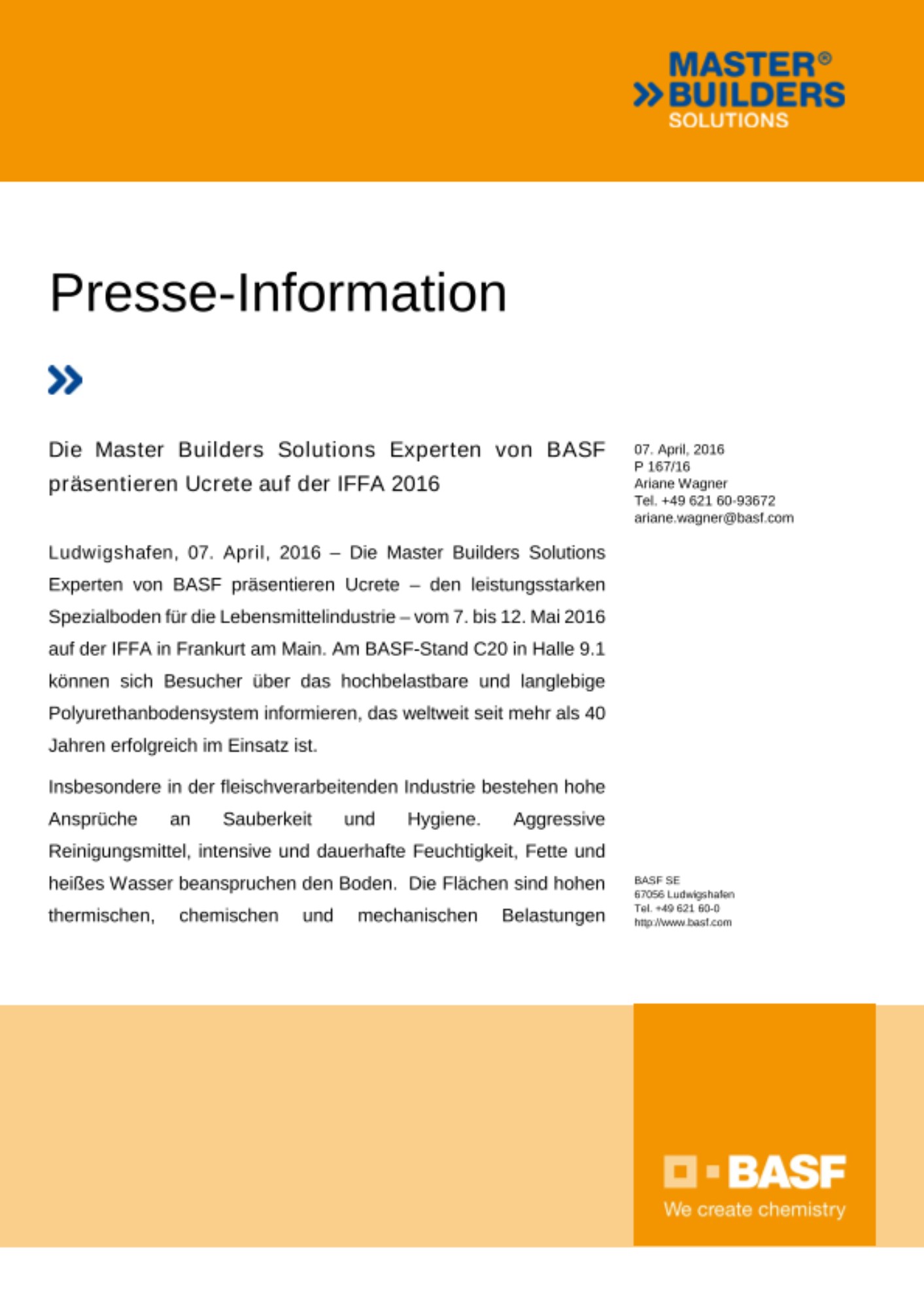 Ludwigshafen, 07. April, 2016 – Die Master Builders Solutions Experten von BASF präsentieren Ucrete – den leistungsstarken Spezialboden für die Lebensmittelindustrie – vom 7. bis 12. Mai 2016 auf der IFFA in Frankurt am Main. Am BASF-Stand C20 in Halle 9.1 können sich Besucher über das hochbelastbare und langlebige Polyurethanbodensystem informieren, das weltweit seit mehr als 40 Jahren erfolgreich im Einsatz ist.