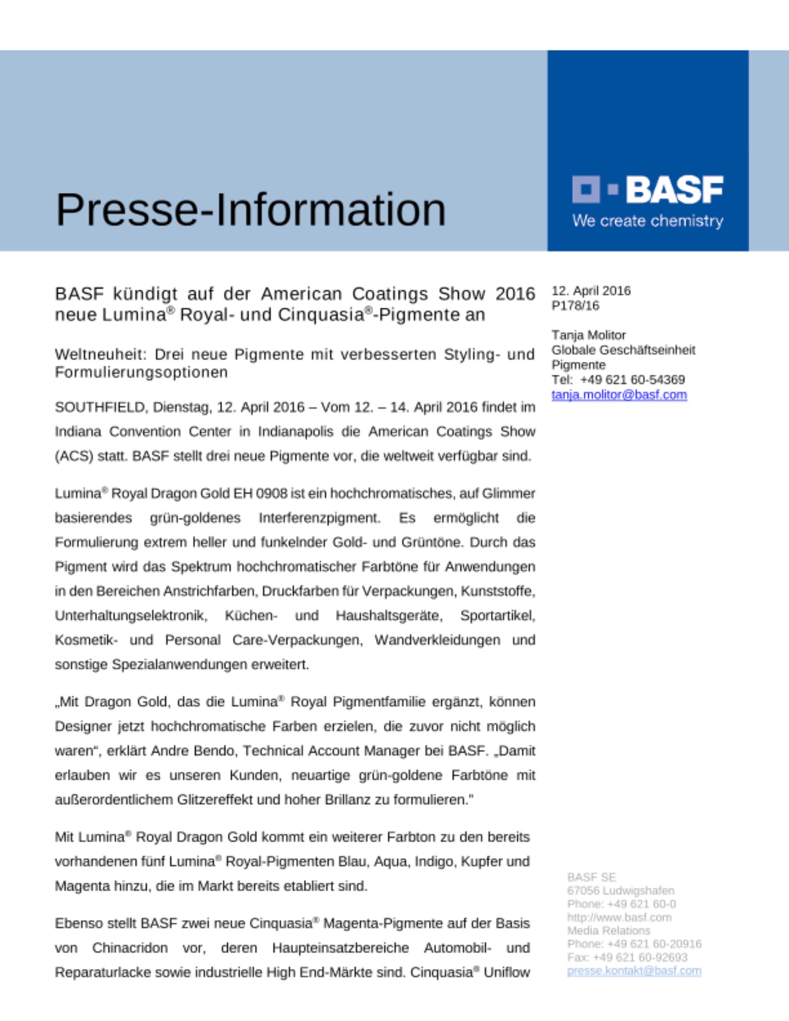 SOUTHFIELD, Dienstag, 12. April 2016 – Vom 12. – 14. April 2016 findet im Indiana Convention Center in Indianapolis die American Coatings Show (ACS) statt. BASF stellt drei neue Pigmente vor, die weltweit verfügbar sind.
