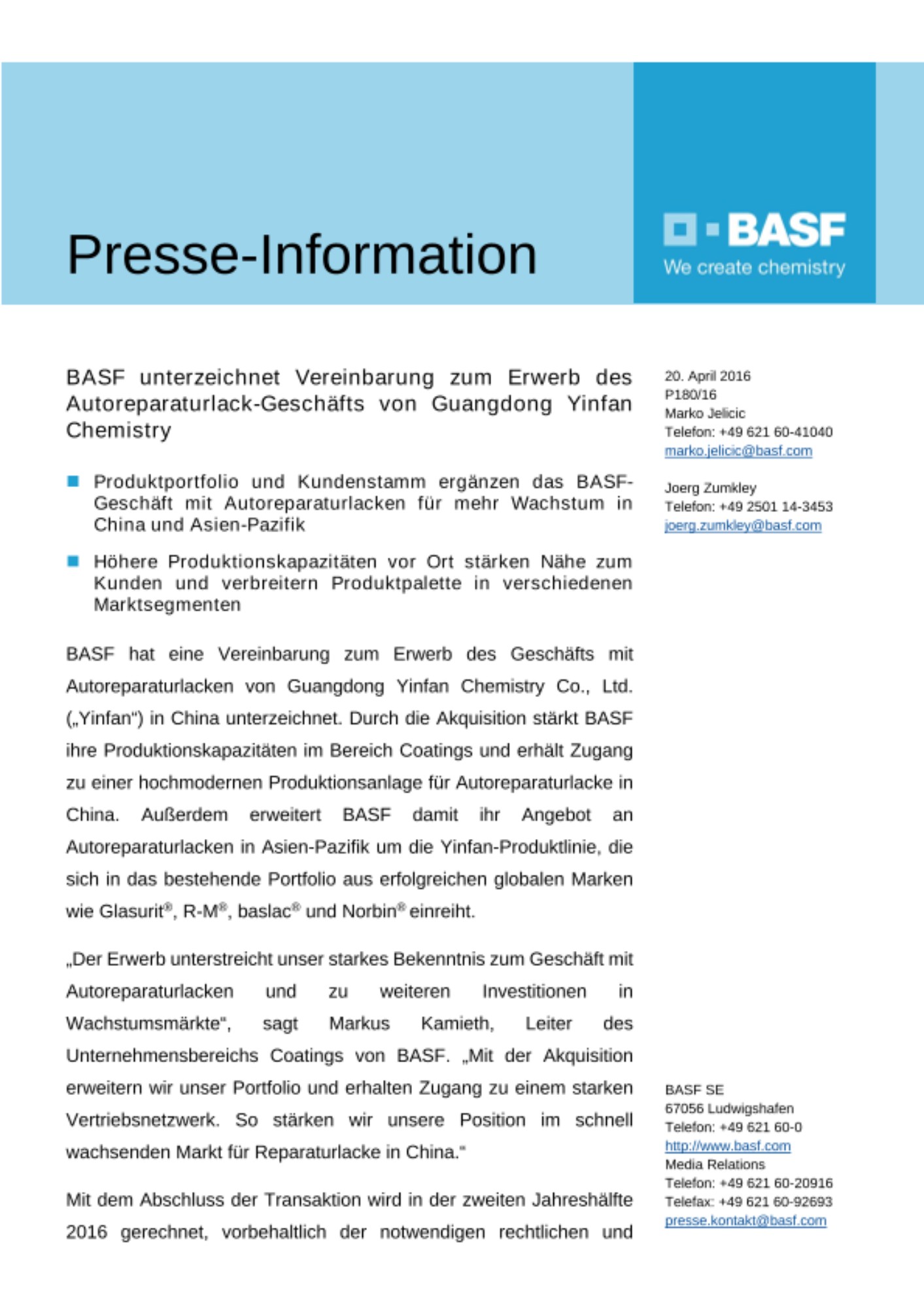 „Der Erwerb unterstreicht unser starkes Bekenntnis zum Geschäft mit Autoreparaturlacken und zu weiteren Investitionen in Wachstumsmärkte“, sagt Markus Kamieth, Leiter des Unternehmensbereichs Coatings von BASF. „Mit der Akquisition erweitern wir unser Portfolio und erhalten Zugang zu einem starken Vertriebsnetzwerk. So stärken wir unsere Position im schnell wachsenden Markt für Reparaturlacke in China.“