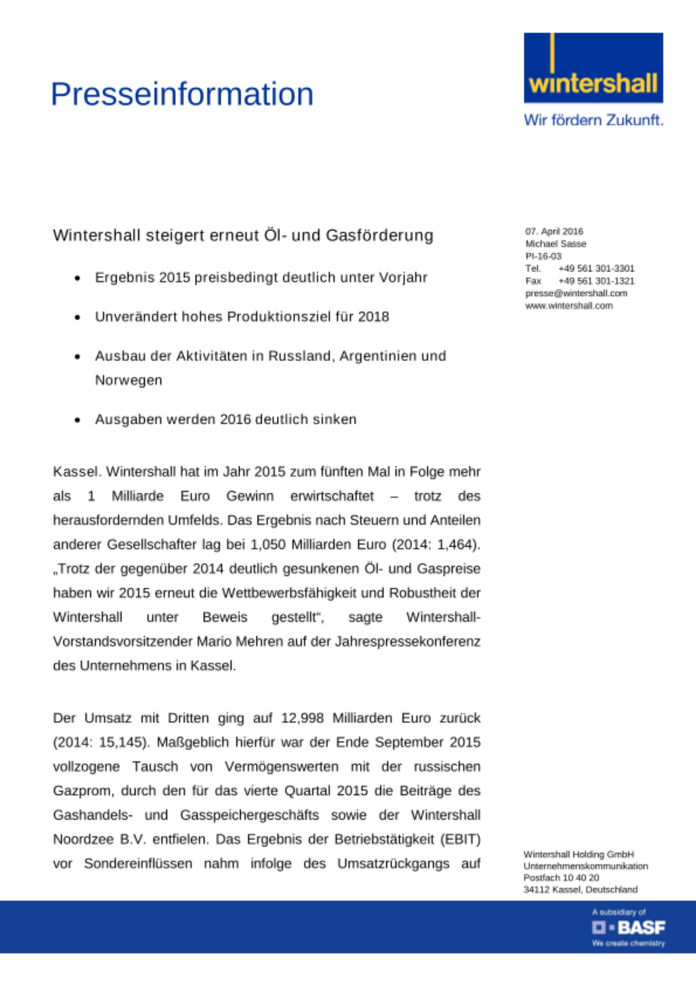 Kassel. Wintershall hat im Jahr 2015 zum fünften Mal in Folge mehr als 1 Milliarde Euro Gewinn erwirtschaftet – trotz des herausfordernden Umfelds. Das Ergebnis nach Steuern und Anteilen anderer Gesellschafter lag bei 1,050 Milliarden Euro (2014: 1,464). „Trotz der gegenüber 2014 deutlich gesunkenen Öl- und Gaspreise haben wir 2015 erneut die Wettbewerbsfähigkeit und Robustheit der Wintershall unter Beweis gestellt“, sagte Wintershall-Vorstandsvorsitzender Mario Mehren auf der Jahrespressekonferenz des Unternehmens in Kassel.