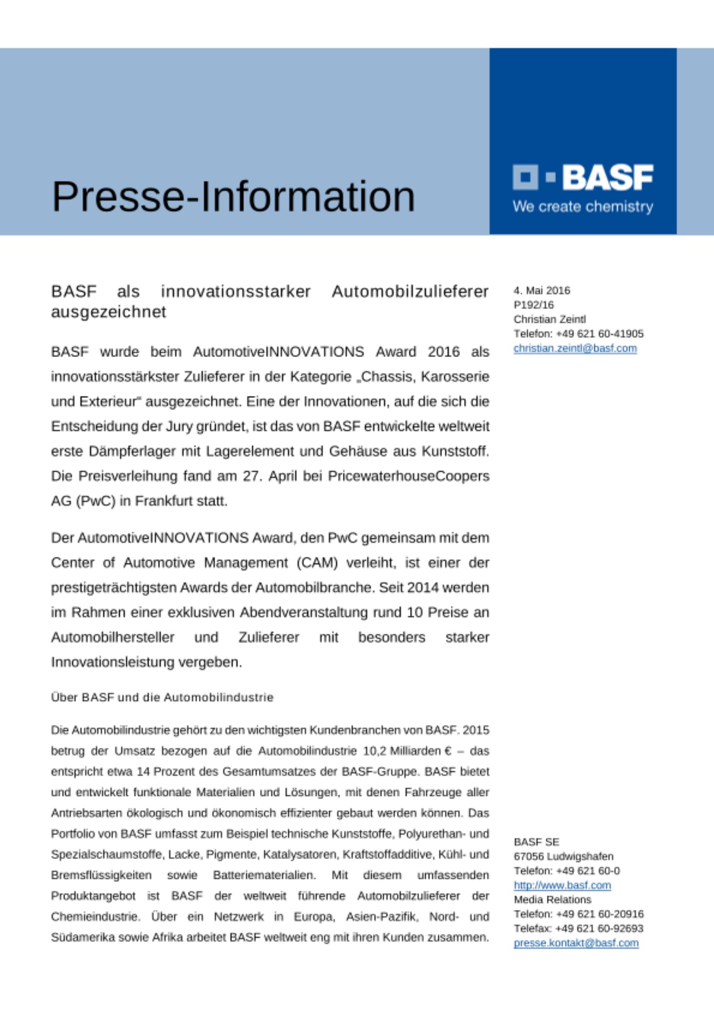 Die Automobilindustrie gehört zu den wichtigsten Kundenbranchen von BASF. 2015 betrug der Umsatz bezogen auf die Automobilindustrie 10,2 Milliarden € – das entspricht etwa 14 Prozent des Gesamtumsatzes der BASF-Gruppe. BASF bietet und entwickelt funktionale Materialien und Lösungen, mit denen Fahrzeuge aller Antriebsarten ökologisch und ökonomisch effizienter gebaut werden können. Das Portfolio von BASF umfasst zum Beispiel technische Kunststoffe, Polyurethan- und Spezialschaumstoffe, Lacke, Pigmente, Katalysatoren, Kraftstoffadditive, Kühl- und Bremsflüssigkeiten sowie Batteriematerialien. Mit diesem umfassenden Produktangebot ist BASF der weltweit führende Automobilzulieferer der Chemieindustrie. Über ein Netzwerk in Europa, Asien-Pazifik, Nord- und Südamerika sowie Afrika arbeitet BASF weltweit eng mit ihren Kunden zusammen. Weitere Informationen zu den Lösungen von BASF für die Automobilindustrie sind im Internet unter www.automotive.basf.com verfügbar.