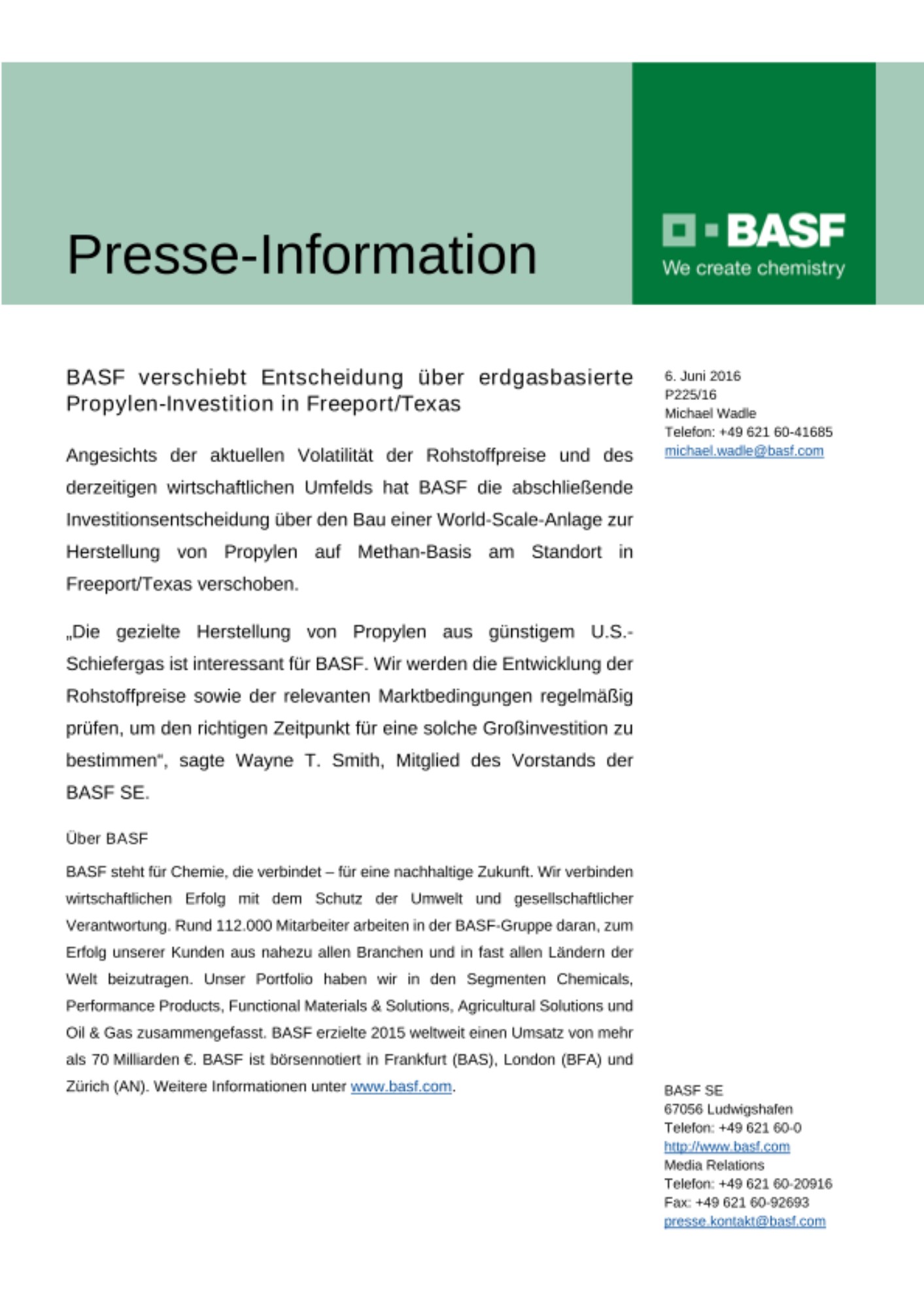 Angesichts der aktuellen Volatilität der Rohstoffpreise und des derzeitigen wirtschaftlichen Umfelds hat BASF die abschließende Investitionsentscheidung über den Bau einer World-Scale-Anlage zur Herstellung von Propylen auf Methan-Basis am Standort in Freeport/Texas verschoben.