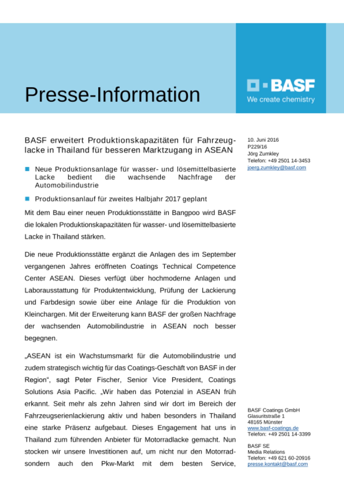 „ASEAN ist ein Wachstumsmarkt für die Automobilindustrie und zudem strategisch wichtig für das Coatings-Geschäft von BASF in der Region“, sagt Peter Fischer, Senior Vice President, Coatings Solutions Asia Pacific. „Wir haben das Potenzial in ASEAN früh erkannt. Seit mehr als zehn Jahren sind wir dort im Bereich der Fahrzeugserienlackierung aktiv und haben besonders in Thailand eine starke Präsenz aufgebaut. Dieses Engagement hat uns in Thailand zum führenden Anbieter für Motorradlacke gemacht. Nun stocken wir unsere Investitionen auf, um nicht nur den Motorrad- sondern auch den Pkw-Markt mit dem besten Service, ausgezeichneter Qualität sowie effizienten und nachhaltigen Beschichtungslösungen zu bedienen. Dazu zählen auch Technologien wie unser integrierter Applikationsprozess.“