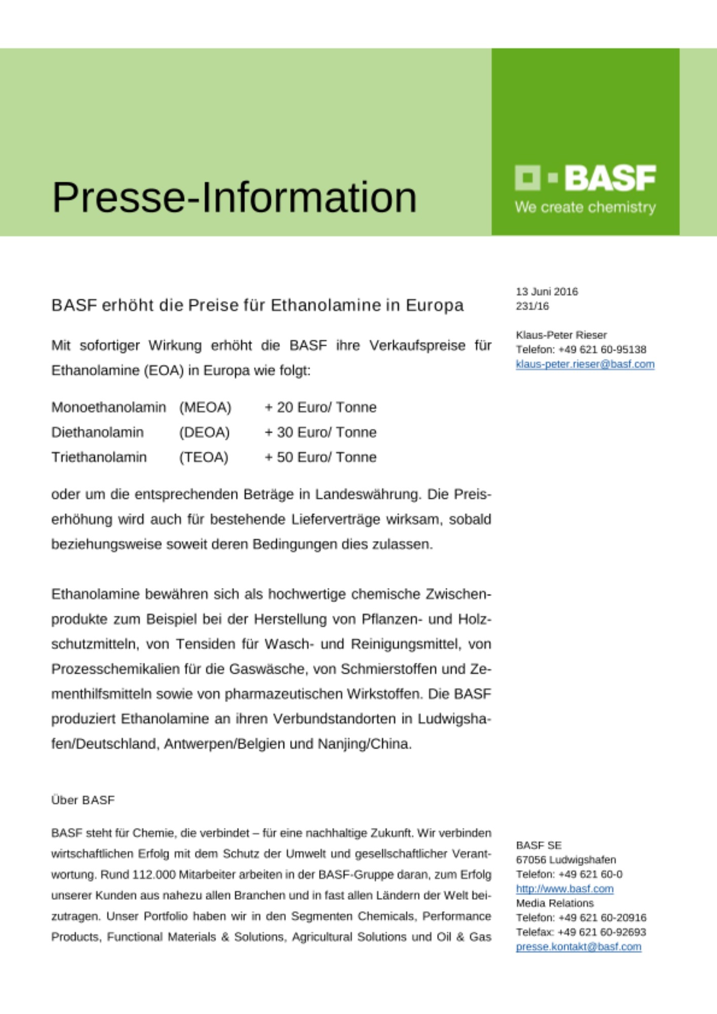 Mit sofortiger Wirkung erhöht die BASF ihre Verkaufspreise für