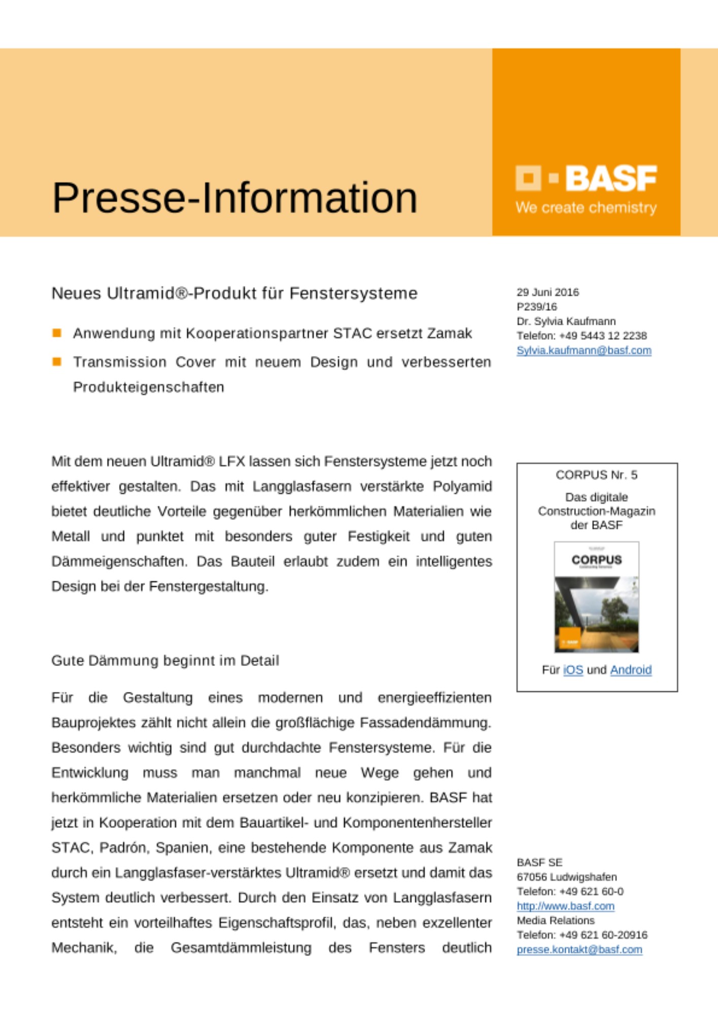 Der Bereich Performance Materials der BASF bündelt das gesamte werkstoffliche Know-how der BASF für innovative, maßgeschneiderte Kunststoffe unter einem Dach. Der Bereich, der in vier großen Branchen – Transportwesen, Bauwirtschaft, industrielle Anwendungen und Konsumgüter – aktiv ist, verfügt über ein breites Portfolio von Produkten und Services sowie ein tiefes Verständnis für anwendungsorientierte Systemlösungen. Wesentliche Treiber für Profitabilität und Wachstum sind unsere enge Zusammenarbeit mit den Kunden und ein klarer Fokus auf Lösungen. Starke F&E-Kompetenzen bilden die Basis für die Entwicklung innovativer Produkte und Anwendungen. 2015 betrug der weltweite Umsatz des Bereichs Performance Materials 6,7 Milliarden €.