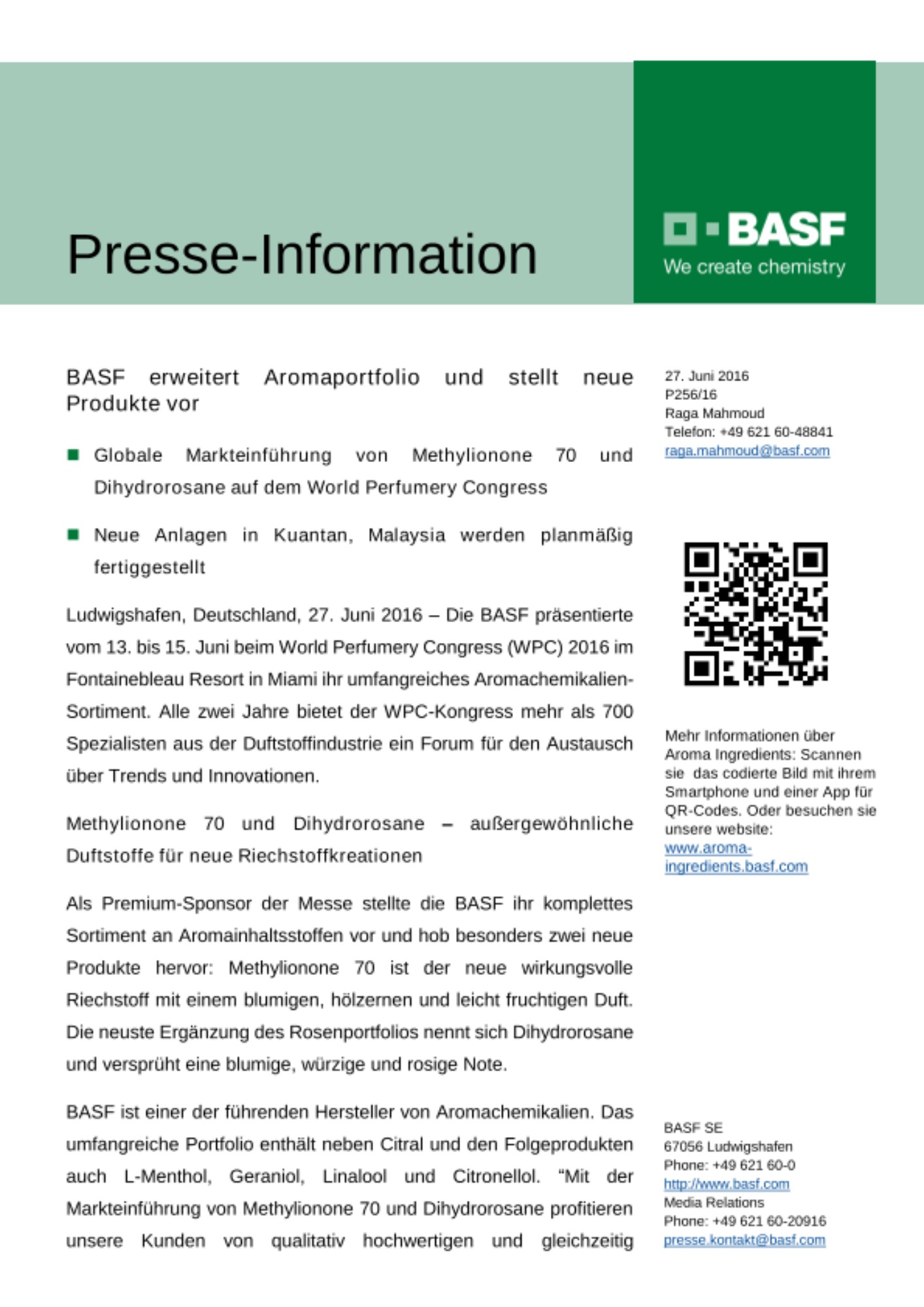 BASF ist einer der führenden Hersteller von Aromachemikalien. Das umfangreiche Portfolio enthält neben Citral und den Folgeprodukten auch L-Menthol, Geraniol, Linalool und Citronellol. “Mit der Markteinführung von Methylionone 70 und Dihydrorosane profitieren unsere Kunden von qualitativ hochwertigen und gleichzeitig kosteneffizienten Riechstoffen der BASF“, sagte Christian Seufert, Vice President BASF Aroma Ingredients.
