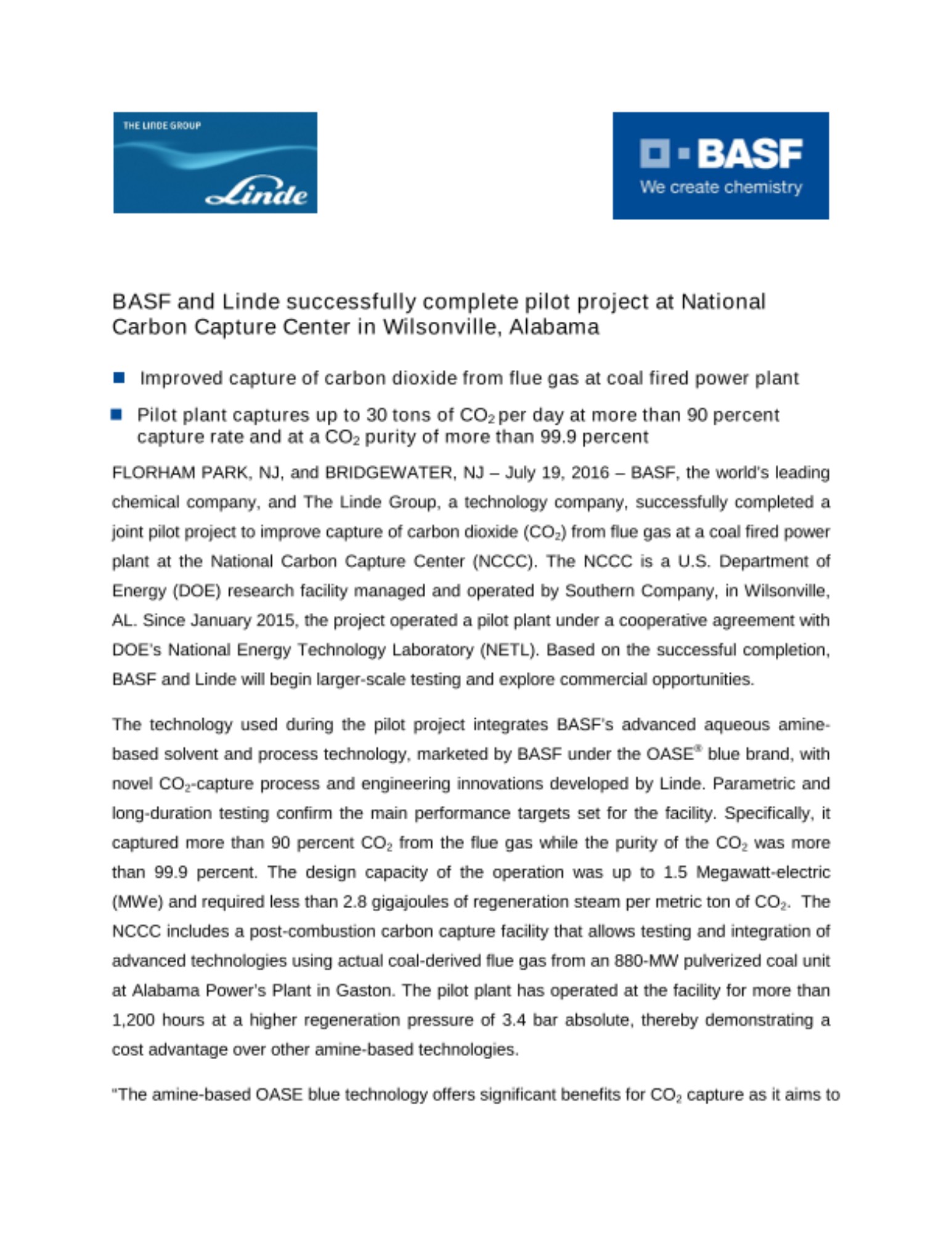 FLORHAM PARK, NJ, and BRIDGEWATER, NJ – July 19, 2016 – BASF, the world’s leading chemical company, and The Linde Group, a technology company, successfully completed a joint pilot project to improve capture of carbon dioxide (CO2) from flue gas at a coal fired power plant at the National Carbon Capture Center (NCCC). The NCCC is a U.S. Department of Energy (DOE) research facility managed and operated by Southern Company, in Wilsonville, AL. Since January 2015, the project operated a pilot plant under a cooperative agreement with DOE’s National Energy Technology Laboratory (NETL). Based on the successful completion, BASF and Linde will begin larger-scale testing and explore commercial opportunities.
