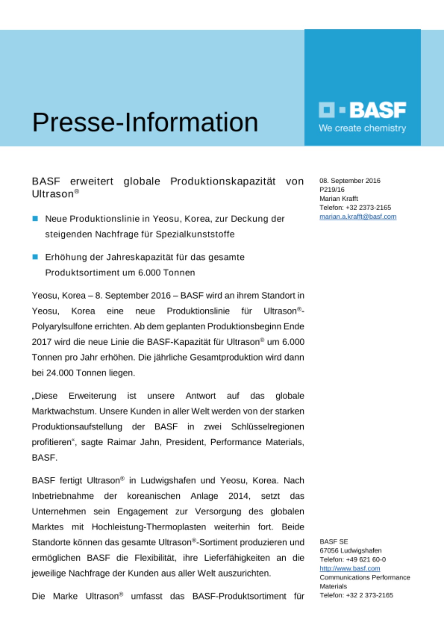 BASF erweitert globale Produktionskapazität von Ultrason®