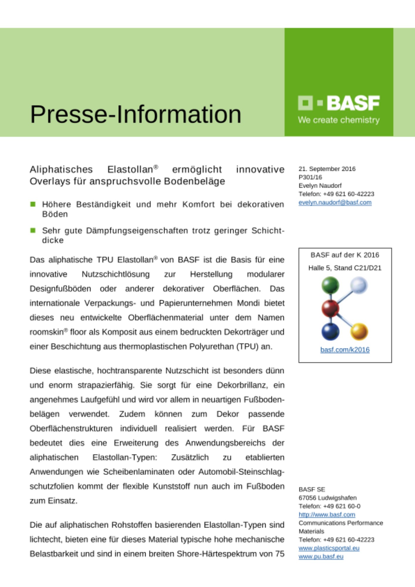 Das aliphatische TPU Elastollan® von BASF ist die Basis für eine innovative Nutzschichtlösung zur Herstellung modularer Designfußböden oder anderer dekorativer Oberflächen. Das internationale Verpackungs- und Papierunternehmen Mondi bietet dieses neu entwickelte Oberflächenmaterial unter dem Namen roomskin® floor als Komposit aus einem bedruckten Dekorträger und einer Beschichtung aus thermoplastischen Polyurethan (TPU) an.