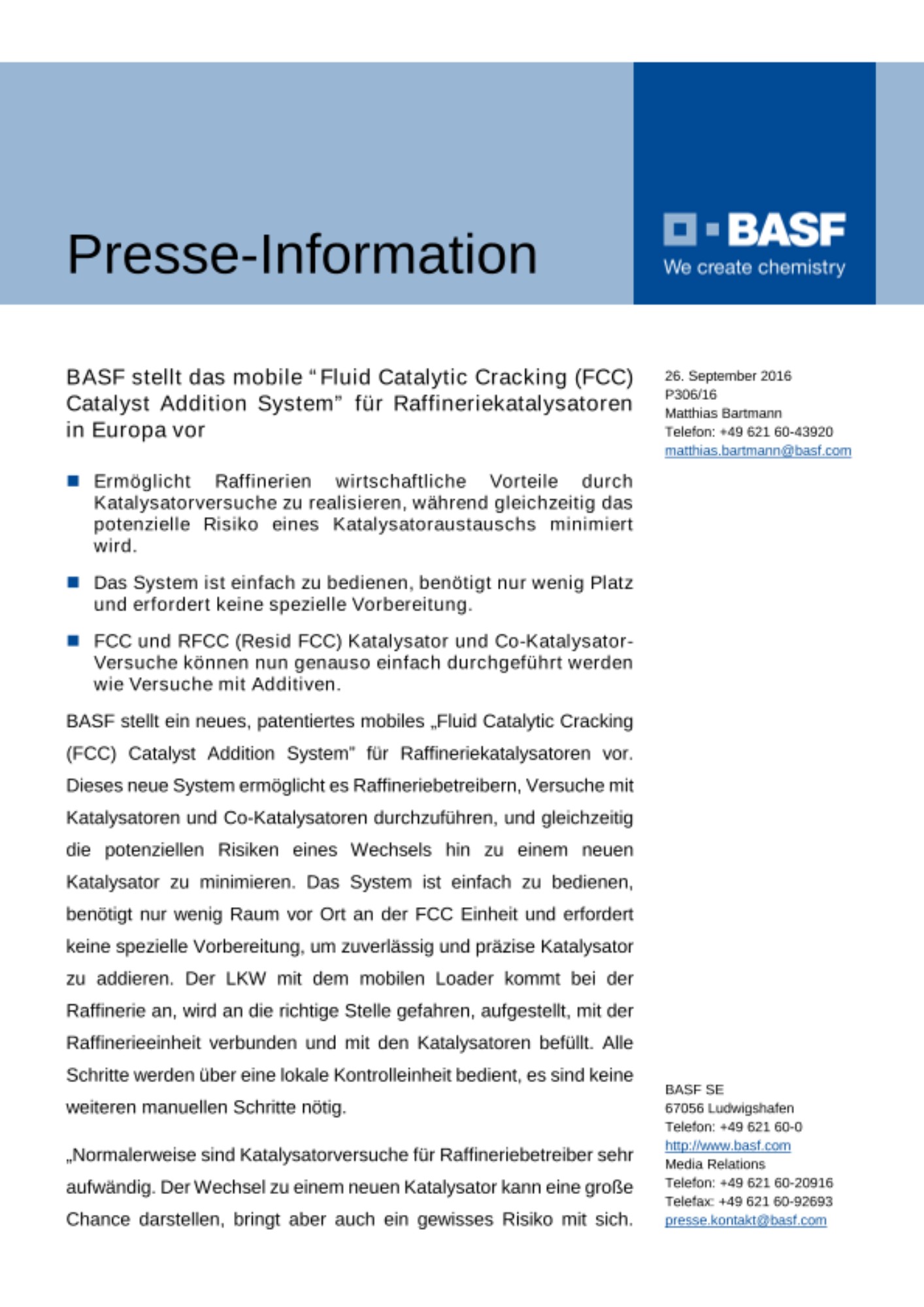 „Das mobile ‚FCC Catalyst Addition System’ der BASF erlaubt es Raffineriebetreibern, ihre Ausbeute zu erhöhen und gibt ihnen die Flexibilität, in der Produktion neue Katalysatoren einzusetzen. Ein neuer Katalysator kann in der FCC Einheit des Kunden getestet und validiert werden, während der alte Katalysator weiterhin im Lagerbehälter vorrätig ist. Darüber hinaus kann das System genutzt werden, um die Inspektion, Reparatur oder den Tausch bestehender eingebauter FCC Additionssysteme durchzuführen“, fügt Stefano Riva hinzu, der den Technical Service für Raffineriekatalysatoren von BASF in Europa leitet. Das mobile „FCC Catalyst Addition System“ wird aktuell exklusiv in der Region Europa angeboten.