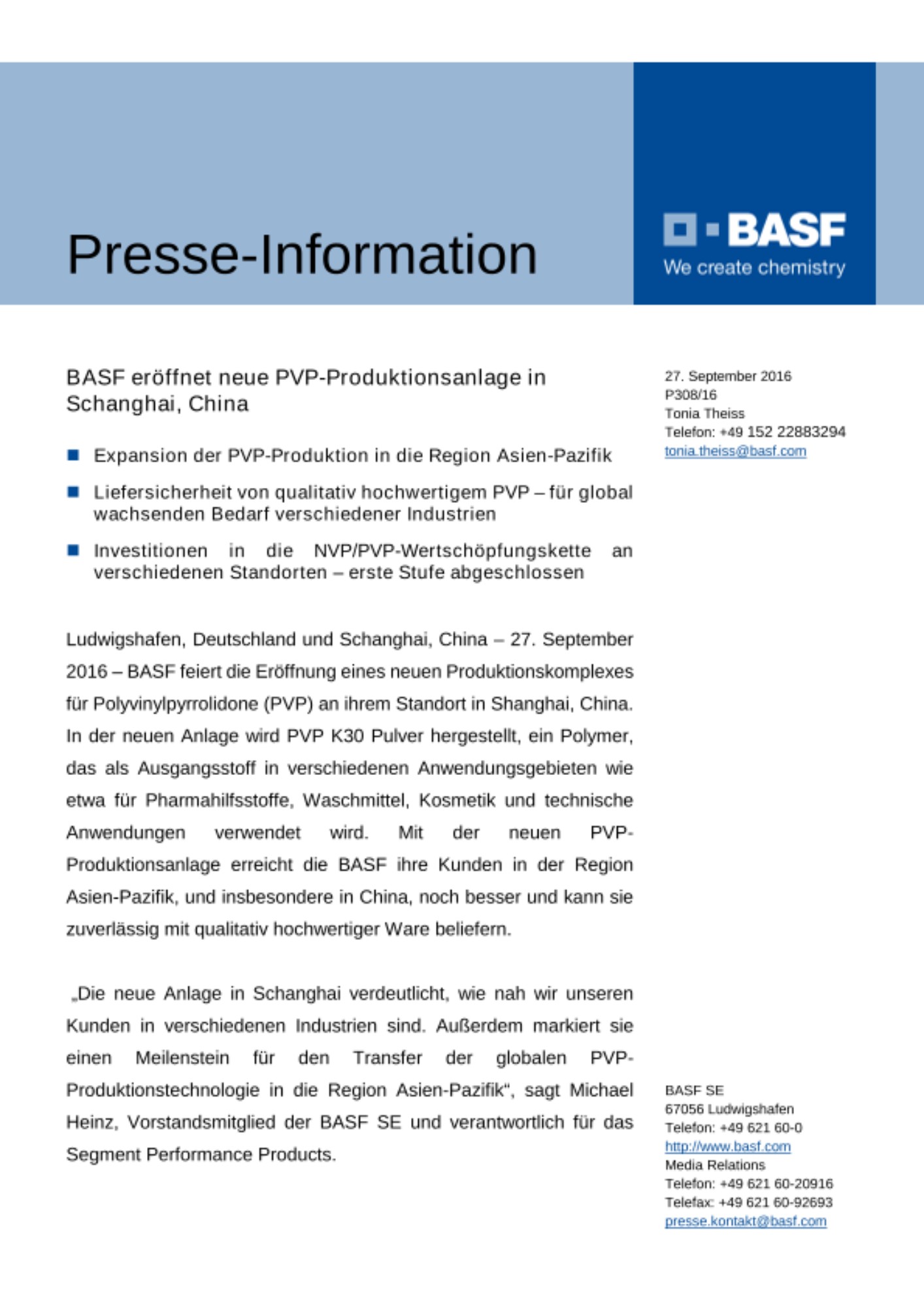 „Die neue Anlage in Schanghai verdeutlicht, wie nah wir unseren Kunden in verschiedenen Industrien sind. Außerdem markiert sie einen Meilenstein für den Transfer der globalen PVP-Produktionstechnologie in die Region Asien-Pazifik“, sagt Michael Heinz, Vorstandsmitglied der BASF SE und verantwortlich für das Segment Performance Products.