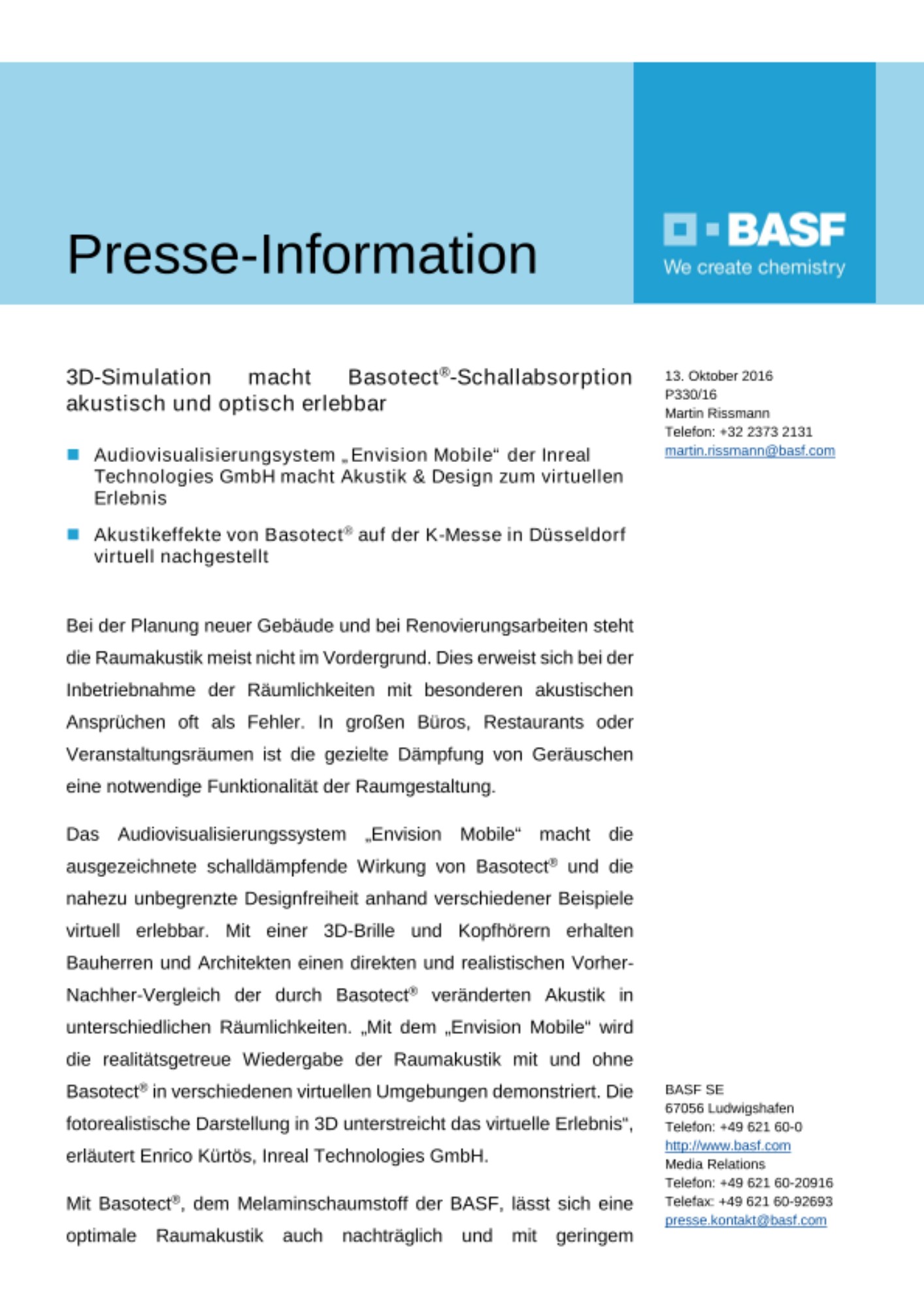 Das Audiovisualisierungssystem „Envision Mobile“ macht die ausgezeichnete schalldämpfende Wirkung von Basotect® und die nahezu unbegrenzte Designfreiheit anhand verschiedener Beispiele virtuell erlebbar. Mit einer 3D-Brille und Kopfhörern erhalten Bauherren und Architekten einen direkten und realistischen Vorher-Nachher-Vergleich der durch Basotect® veränderten Akustik in unterschiedlichen Räumlichkeiten. „Mit dem „Envision Mobile“ wird die realitätsgetreue Wiedergabe der Raumakustik mit und ohne Basotect® in verschiedenen virtuellen Umgebungen demonstriert. Die fotorealistische Darstellung in 3D unterstreicht das virtuelle Erlebnis“, erläutert Enrico Kürtös, Inreal Technologies GmbH.