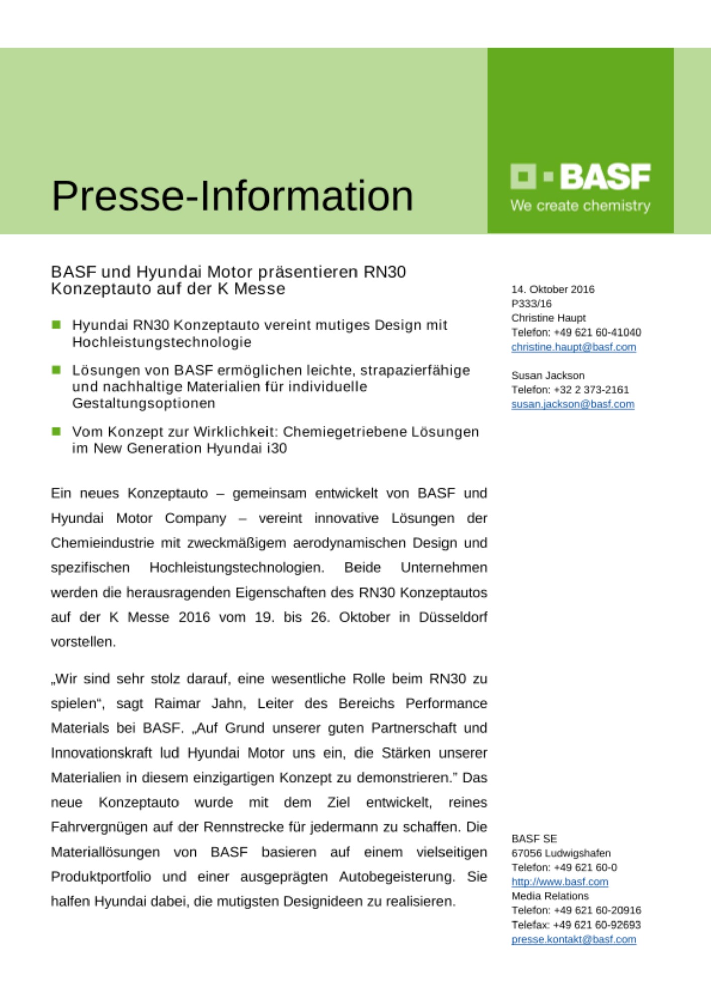 Ein neues Konzeptauto – gemeinsam entwickelt von BASF und Hyundai Motor Company – vereint innovative Lösungen der Chemieindustrie mit zweckmäßigem aerodynamischen Design und spezifischen Hochleistungstechnologien. Beide Unternehmen werden die herausragenden Eigenschaften des RN30 Konzeptautos auf der K Messe 2016 vom 19. bis 26. Oktober in Düsseldorf vorstellen.