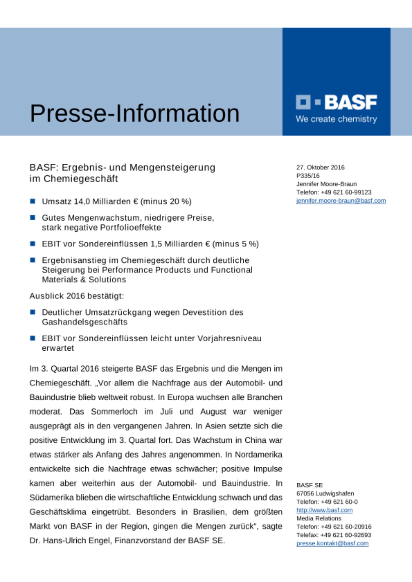 Im 3. Quartal 2016 steigerte BASF das Ergebnis und die Mengen im Chemiegeschäft. „Vor allem die Nachfrage aus der Automobil- und Bauindustrie blieb weltweit robust. In Europa wuchsen alle Branchen moderat. Das Sommerloch im Juli und August war weniger ausgeprägt als in den vergangenen Jahren. In Asien setzte sich die positive Entwicklung im 3. Quartal fort. Das Wachstum in China war etwas stärker als Anfang des Jahres angenommen. In Nordamerika entwickelte sich die Nachfrage etwas schwächer; positive Impulse kamen aber weiterhin aus der Automobil- und Bauindustrie. In Südamerika blieben die wirtschaftliche Entwicklung schwach und das Geschäftsklima eingetrübt. Besonders in Brasilien, dem größten Markt von BASF in der Region, gingen die Mengen zurück“, sagte Dr. Hans-Ulrich Engel, Finanzvorstand der BASF SE.