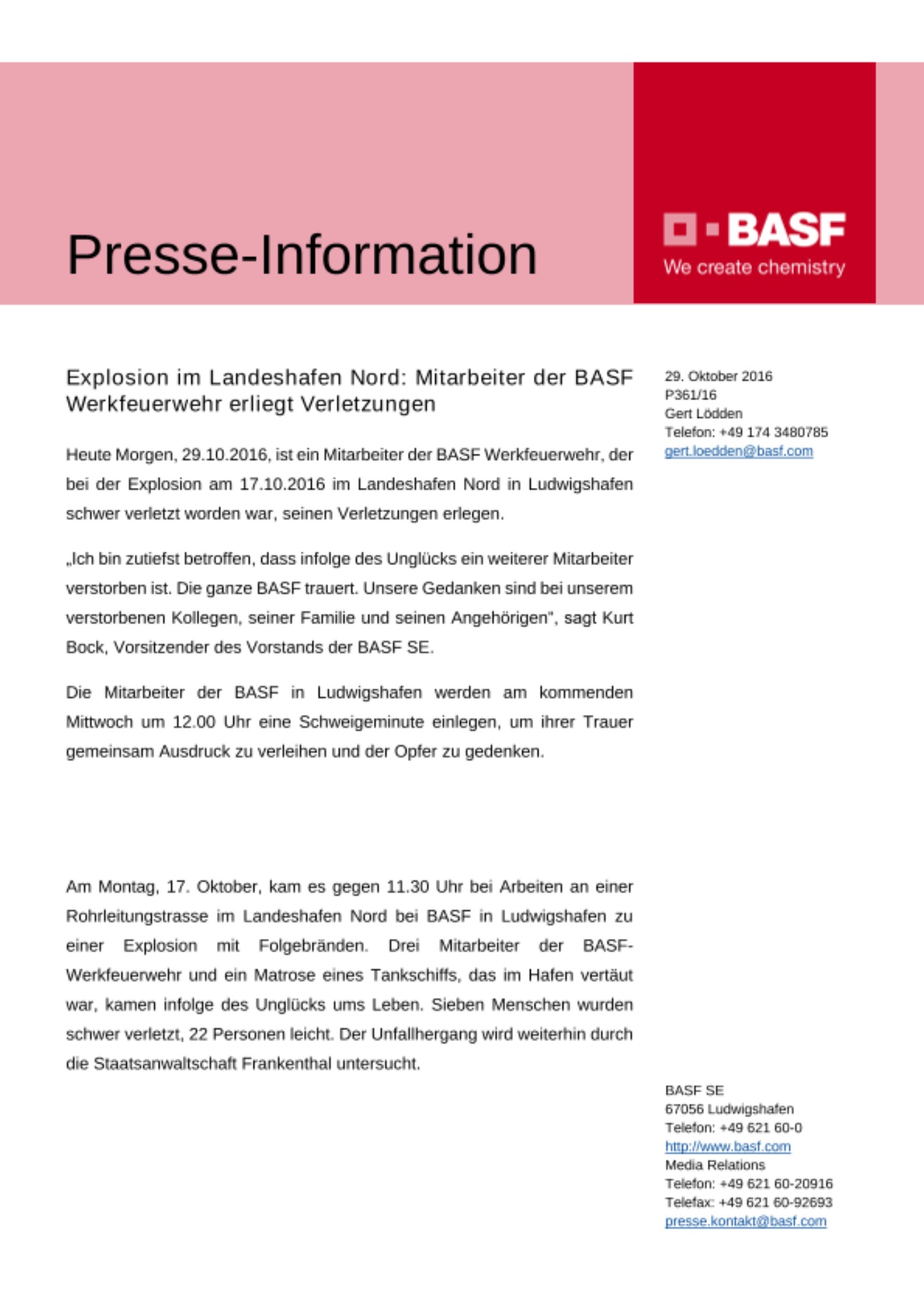 Am Montag, 17. Oktober, kam es gegen 11.30 Uhr bei Arbeiten an einer Rohrleitungstrasse im Landeshafen Nord bei BASF in Ludwigshafen zu einer Explosion mit Folgebränden. Drei Mitarbeiter der BASF-Werkfeuerwehr und ein Matrose eines Tankschiffs, das im Hafen vertäut war, kamen infolge des Unglücks ums Leben. Sieben Menschen wurden schwer verletzt, 22 Personen leicht. Der Unfallhergang wird weiterhin durch die Staatsanwaltschaft Frankenthal untersucht.