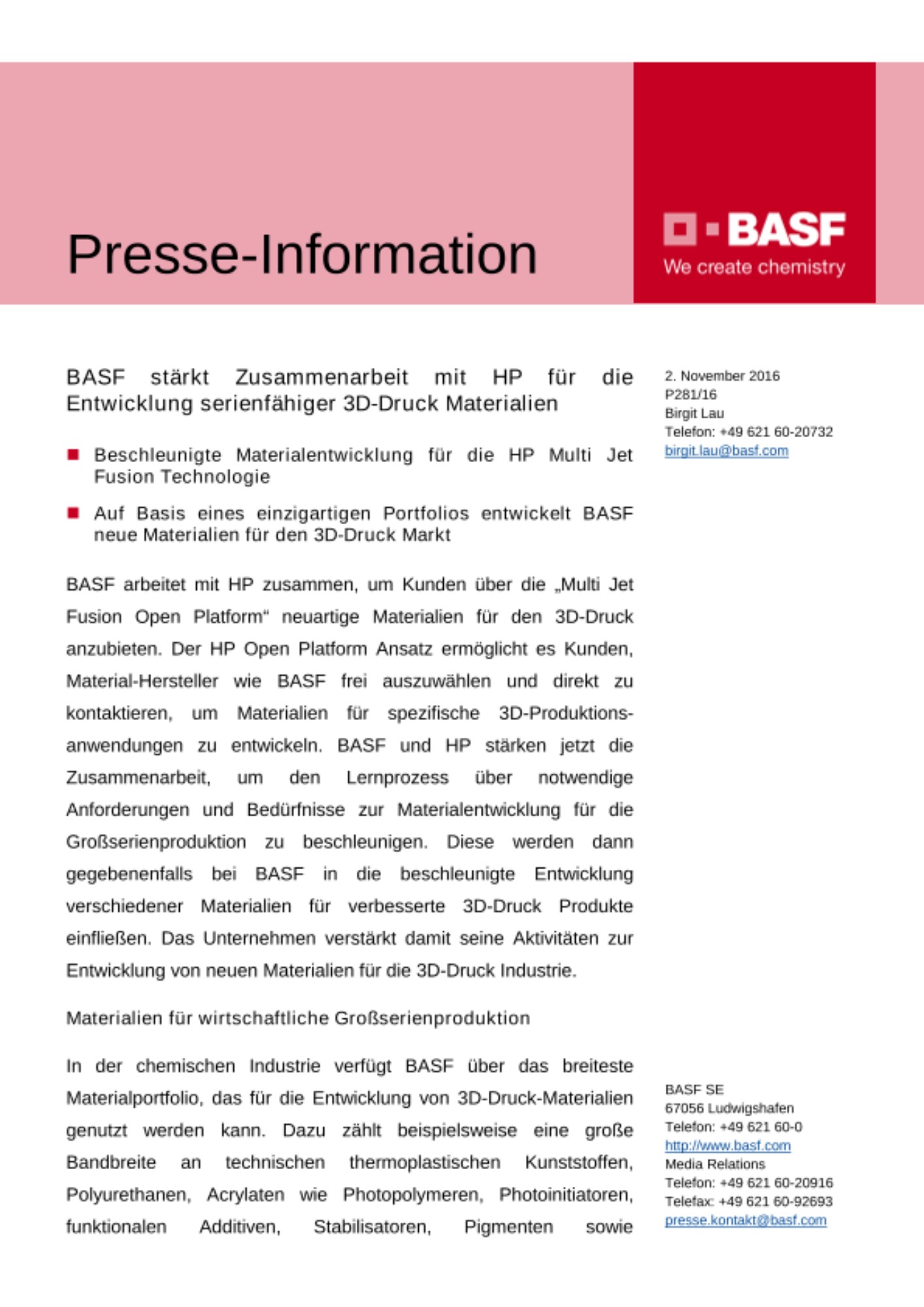 BASF arbeitet mit HP zusammen, um Kunden über die „Multi Jet Fusion Open Platform“ neuartige Materialien für den 3D-Druck anzubieten. Der HP Open Platform Ansatz ermöglicht es Kunden, Material-Hersteller wie BASF frei auszuwählen und direkt zu kontaktieren, um Materialien für spezifische 3D-Produktions-anwendungen zu entwickeln. BASF und HP stärken jetzt die Zusammenarbeit, um den Lernprozess über notwendige Anforderungen und Bedürfnisse zur Materialentwicklung für die Großserienproduktion zu beschleunigen. Diese werden dann gegebenenfalls bei BASF in die beschleunigte Entwicklung verschiedener Materialien für verbesserte 3D-Druck Produkte einfließen. Das Unternehmen verstärkt damit seine Aktivitäten zur Entwicklung von neuen Materialien für die 3D-Druck Industrie.