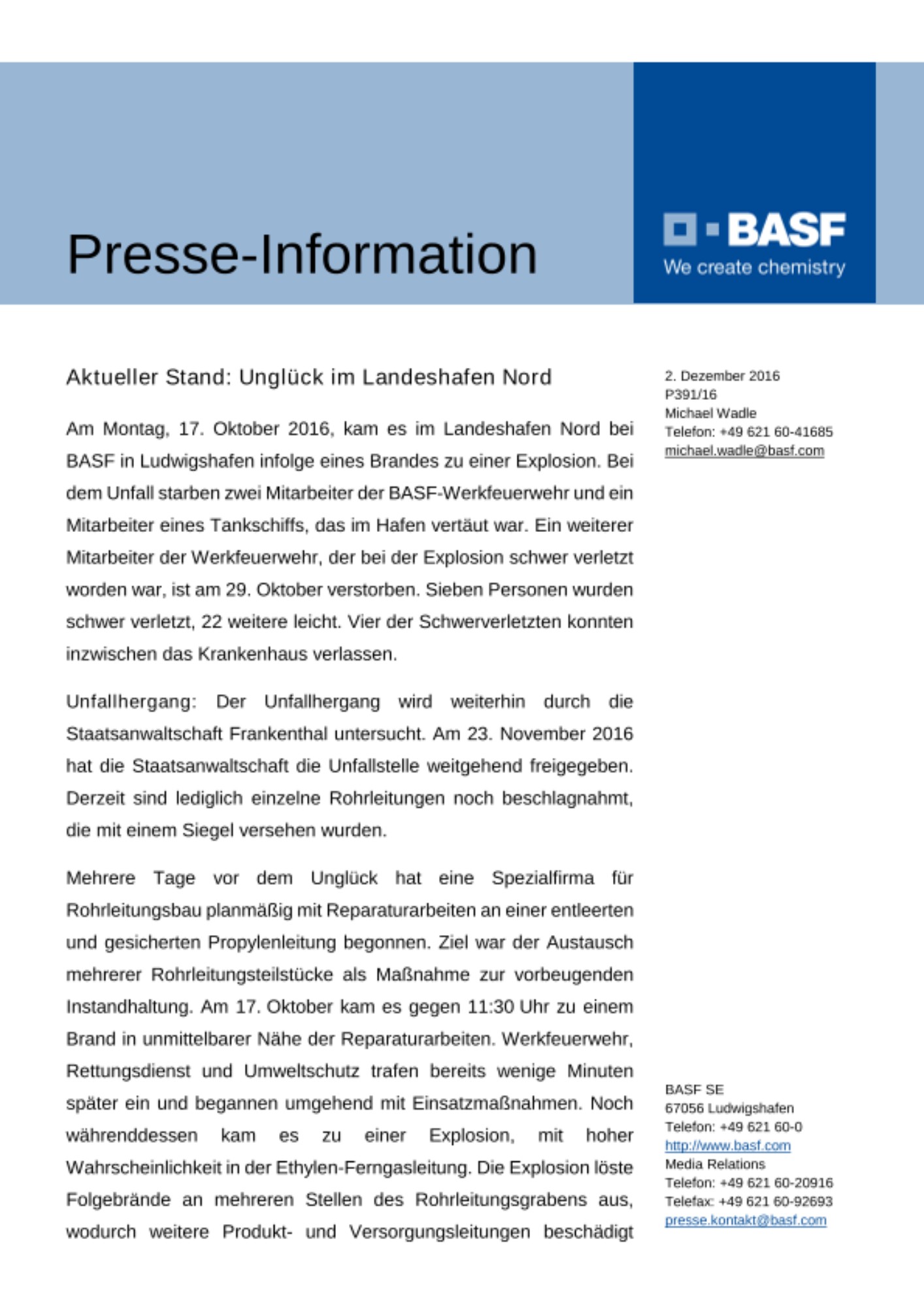 Situation Logistik: Am 23. November 2016 hat die Staatsanwaltschaft die Schadensstelle weitgehend freigegeben. Derzeit sind lediglich einzelne Rohrleitungen noch beschlagnahmt, die mit einem Siegel versehen wurden. Der Landeshafen Nord bleibt weitestgehend außer Betrieb. Die Reparatur- und Sanierungsarbeiten dort werden über einen Zeitraum von einigen Monaten andauern. Am 24. November konnte allerdings an einem Steiger, der nicht von dem Unfall betroffen war, bereits das erste Schiff mit Polyisobutenamin beladen werden. Seit Mitte dieser Woche können weitere Produkte von diesem Steiger ent- und beladen werden. Der Stromhafen, der Hafen auf der Friesenheimer Insel und das Tanklager sind funktionsfähig. Im Hafen auf der Friesenheimer Insel können Flüssigkeiten umgeschlagen werden, im Stromhafen Flüssigkeiten und Feststoffe. Das Tor 15, das nach dem Unglück im Landeshafen Nord am 17. Oktober wegen Sicherungsmaßnahmen an der Schadensstelle geschlossen war, wurde am 2. November wieder vollständig in Betrieb genommen. Die komplette Lkw-Abfertigung läuft seit diesem Zeitpunkt wieder ausschließlich über die Tore 11 und 15. Seit dem 31. Oktober hat auch das Kombiverkehrsterminal den Betrieb wieder aufgenommen. Die Bahnanlagen sind durch den Unfall ebenfalls nicht beschädigt. Der Zugverkehr auf dem Werksgelände findet statt.