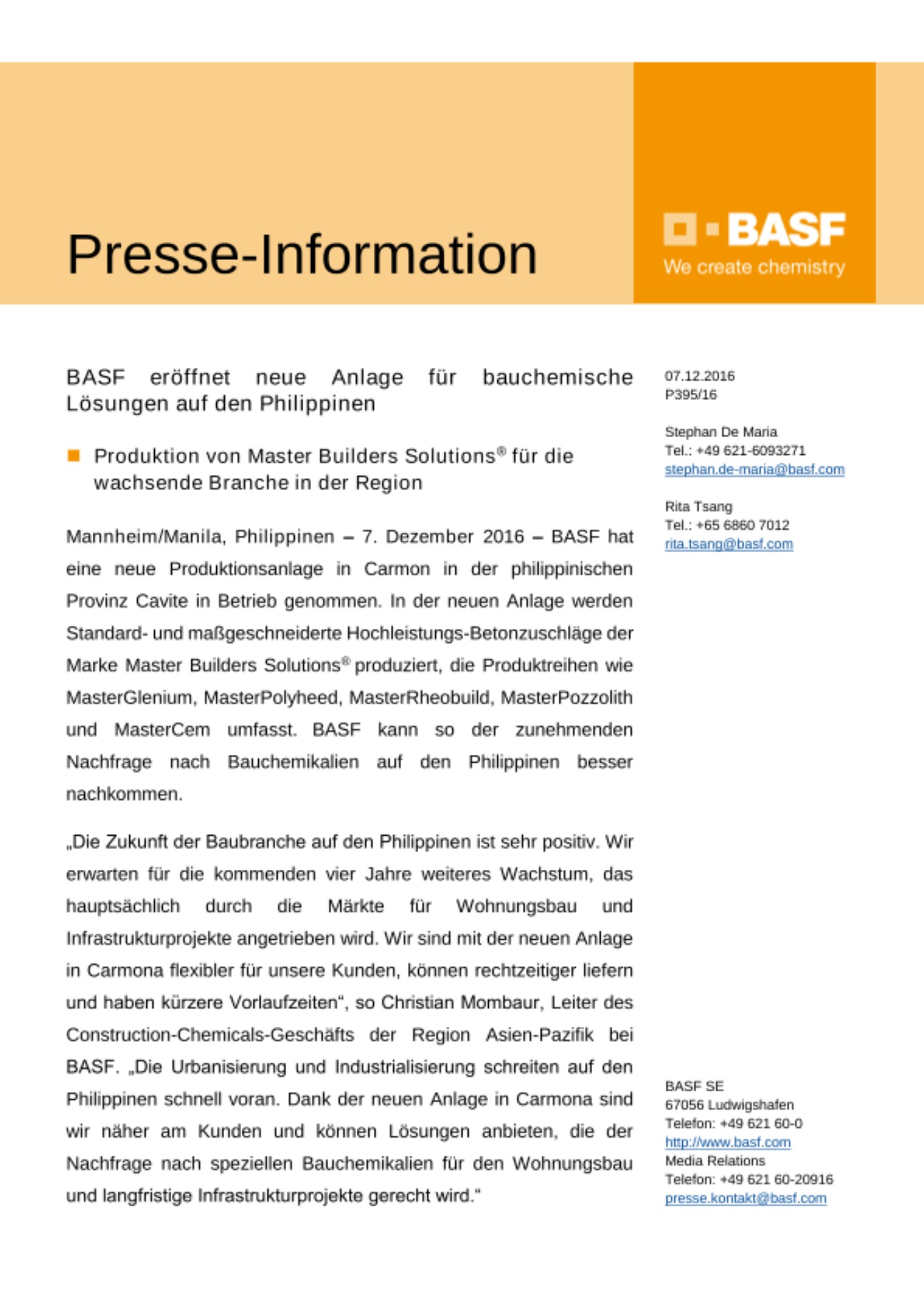 Mannheim/Manila, Philippinen – 7. Dezember 2016 – BASF hat eine neue Produktionsanlage in Carmon in der philippinischen Provinz Cavite in Betrieb genommen. In der neuen Anlage werden Standard- und maßgeschneiderte Hochleistungs-Betonzuschläge der Marke Master Builders Solutions® produziert, die Produktreihen wie MasterGlenium, MasterPolyheed, MasterRheobuild, MasterPozzolith und MasterCem umfasst. BASF kann so der zunehmenden Nachfrage nach Bauchemikalien auf den Philippinen besser nachkommen.
