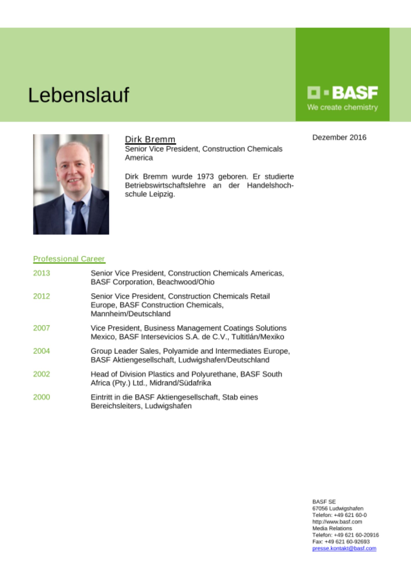 Dirk Bremm (43), Senior Vice President, Construction Chemicals Americas, Beachwood/Ohio, übernimmt am 1. April 2017 als President die Leitung des Unternehmensbereichs Coatings, Münster. Den bisherigen Leiter des Bereichs, Dr. Markus Kamieth (46), hat der Aufsichtsrat der BASF SE heute (15. Dezember 2016) mit Wirkung zum Ende der Hauptversammlung 2017 zum Mitglied des Vorstands bestellt.