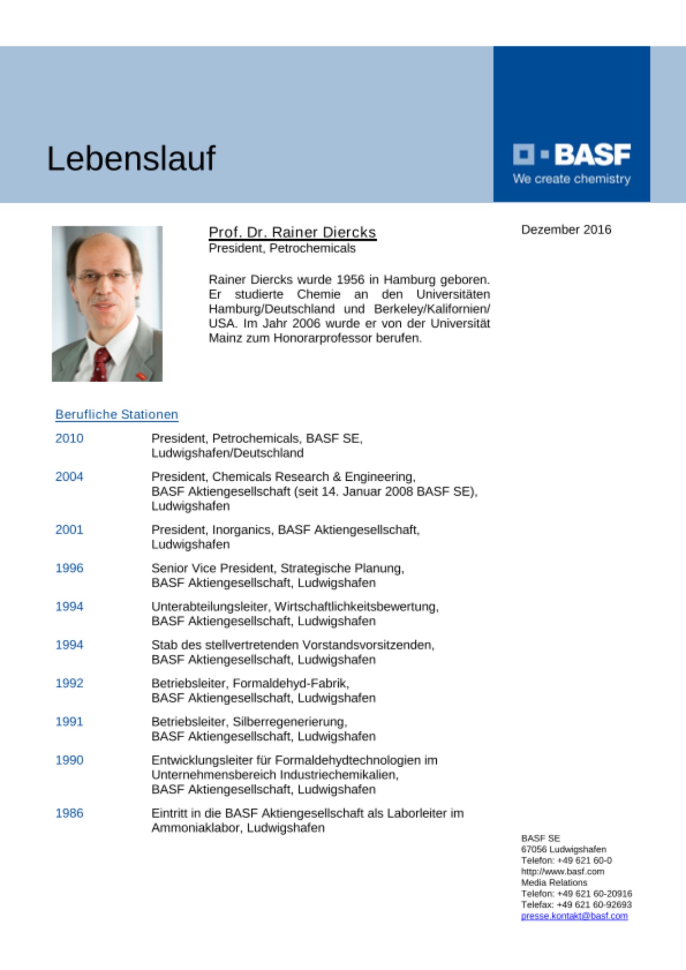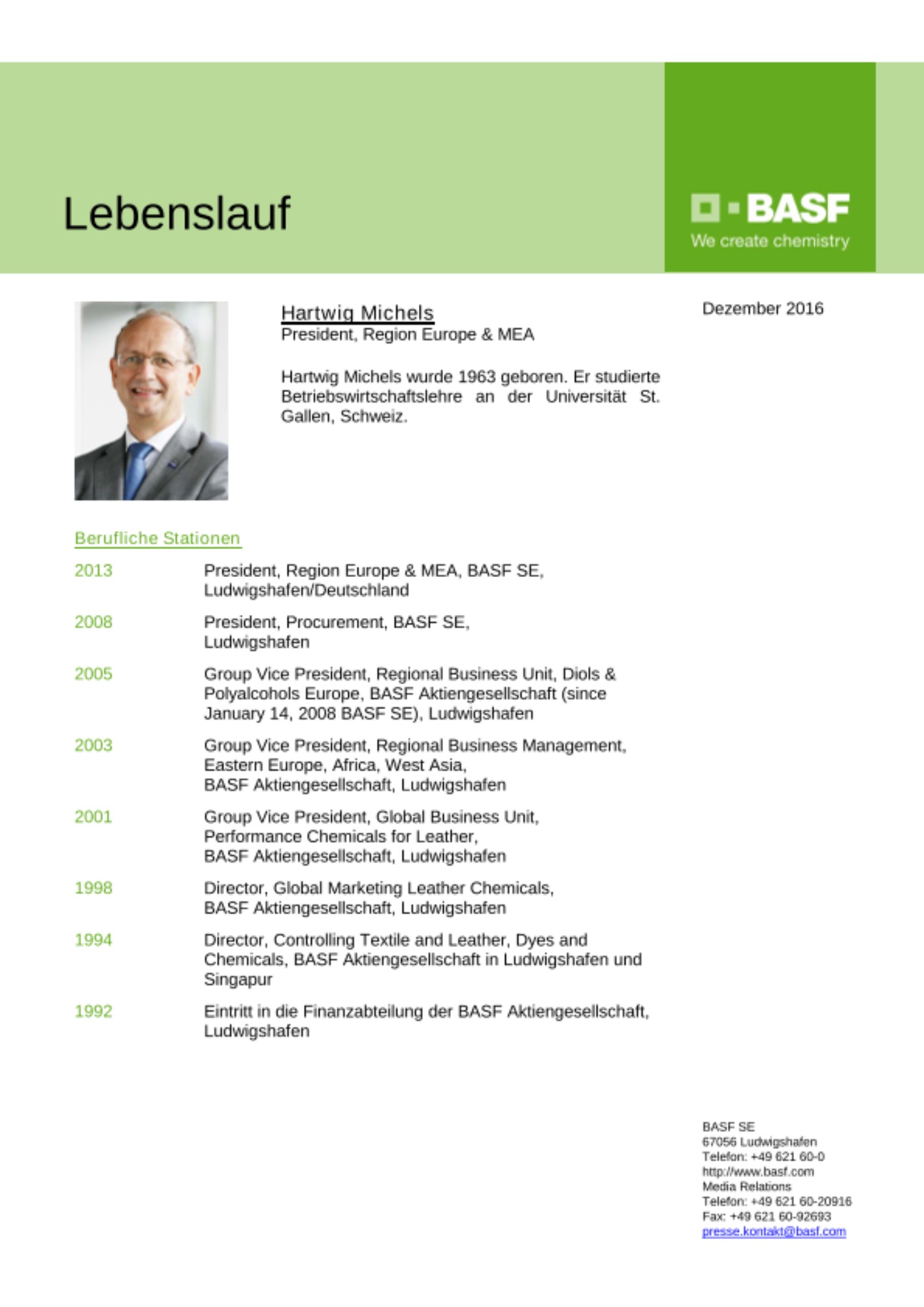 Zum 1. April 2017 übernimmt Hartwig Michels (53), President, Regional Division Europe, Ludwigshafen, die Leitung des Unternehmensbereichs Petrochemicals, Ludwigshafen. Er folgt auf Dr. Rainer Diercks (60), der am 31. März 2017 in den Ruhestand tritt.