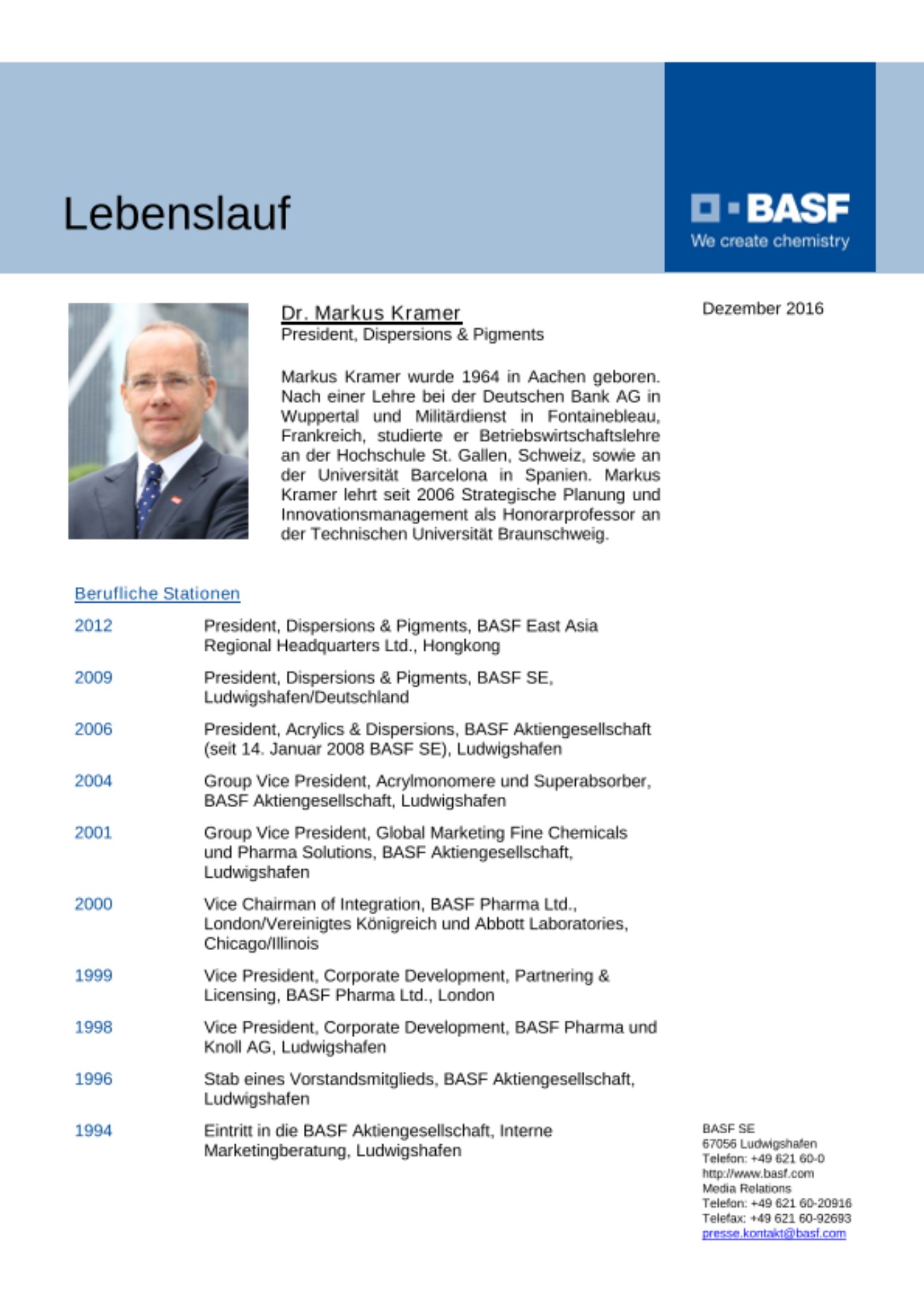 Dr. Markus Kramer (52), President, Dispersions & Pigments, BASF East Asia Regional Headquarters Ltd., Hongkong, wird zum 1. April 2017 als President, Regional Division Europe, Ludwigshafen, Nachfolger von Michels.