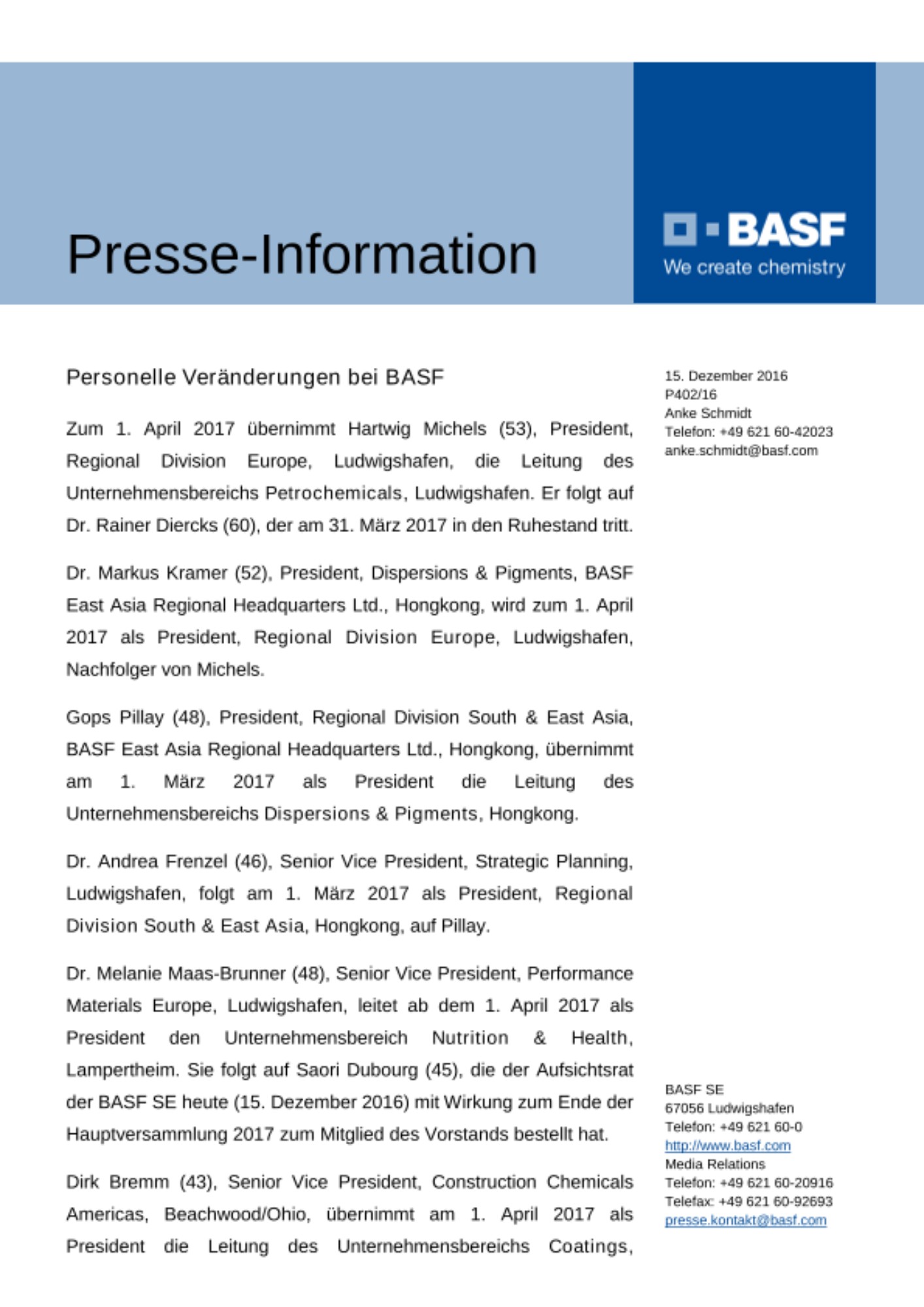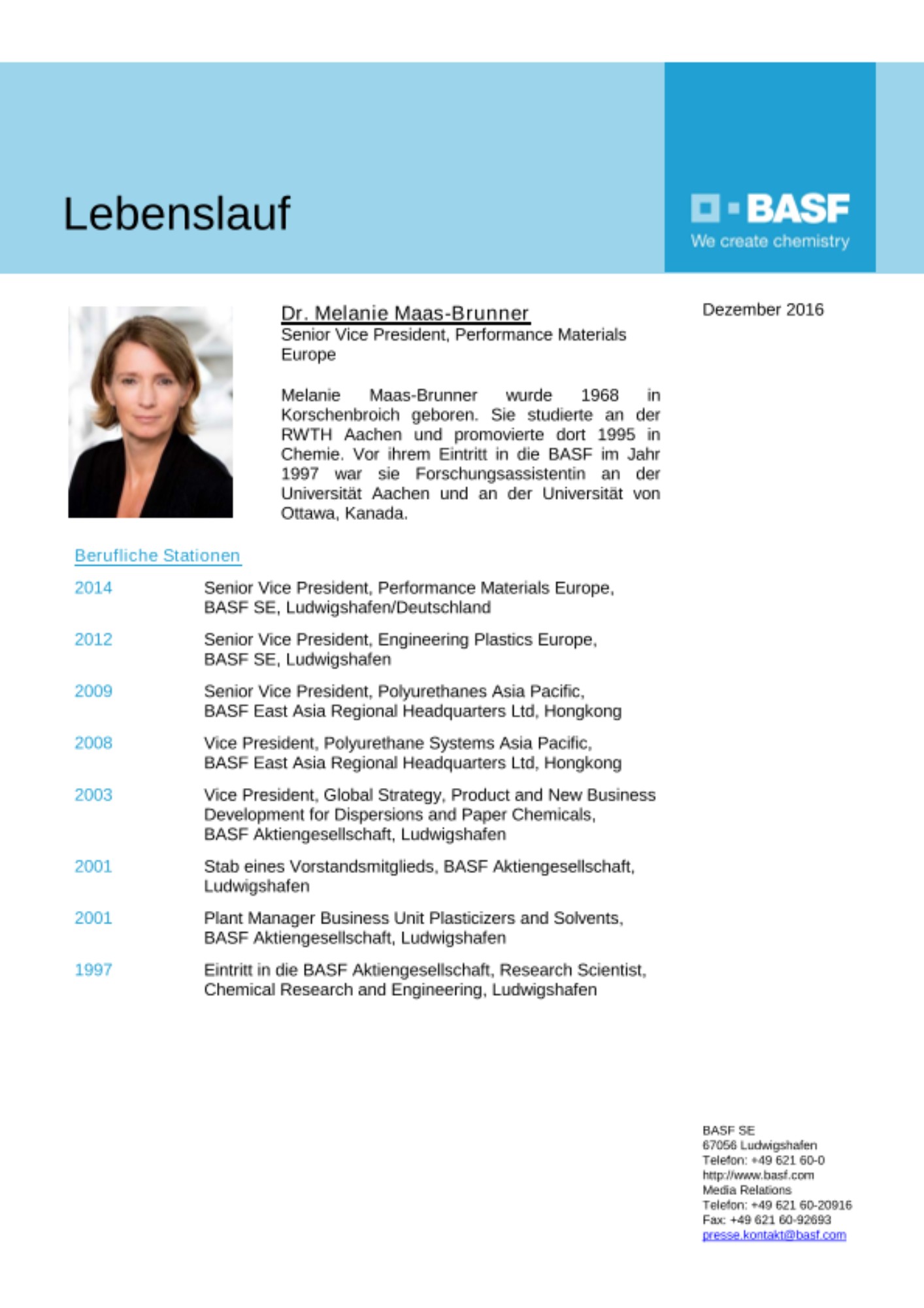 Dr. Melanie Maas-Brunner (48), Senior Vice President, Performance Materials Europe, Ludwigshafen, leitet ab dem 1. April 2017 als President den Unternehmensbereich Nutrition & Health, Lampertheim. Sie folgt auf Saori Dubourg (45), die der Aufsichtsrat der BASF SE heute (15. Dezember 2016) mit Wirkung zum Ende der Hauptversammlung 2017 zum Mitglied des Vorstands bestellt hat.