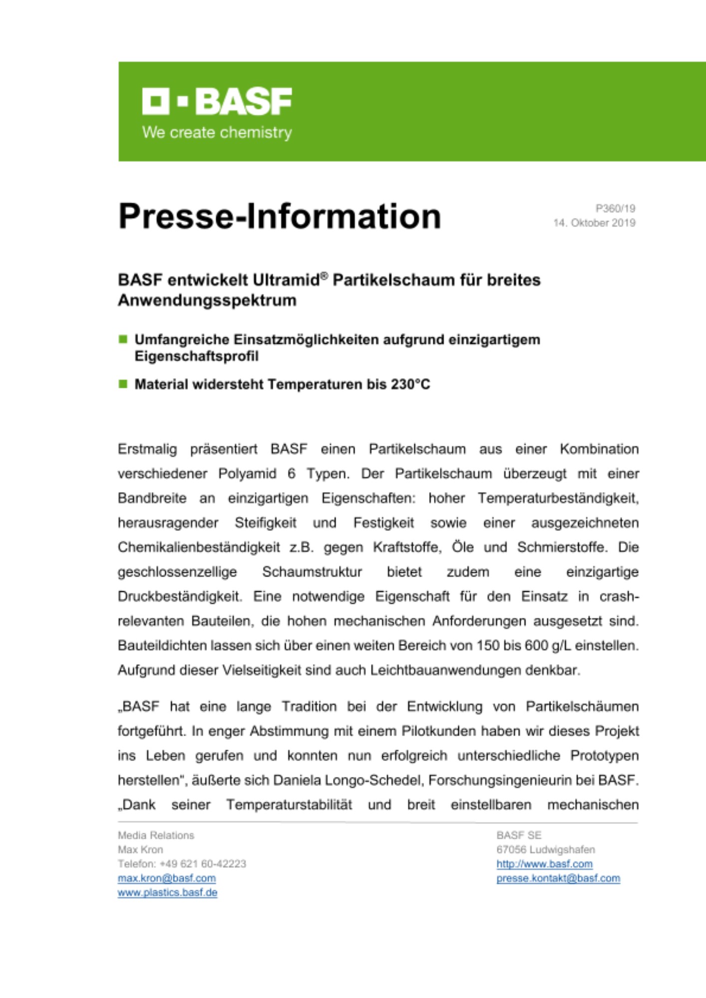 „BASF hat eine lange Tradition bei der Entwicklung von Partikelschäumen fortgeführt. In enger Abstimmung mit einem Pilotkunden haben wir dieses Projekt ins Leben gerufen und konnten nun erfolgreich unterschiedliche Prototypen herstellen“, äußerte sich Daniela Longo-Schedel, Forschungsingenieurin bei BASF. „Dank seiner Temperaturstabilität und breit einstellbaren mechanischen Eigenschaften ist der Partikelschaum für zahlreiche Anwendungen geeignet. Zudem lässt er sich problemlos auf konventionellen EPP-Formteilautomaten sowie innovativen wasserdampffreien Technologien verschiedenster Arten verarbeiten. Um die Produktentwicklung zu finalisieren, arbeiten wir eng mit unseren Kunden zusammen.“